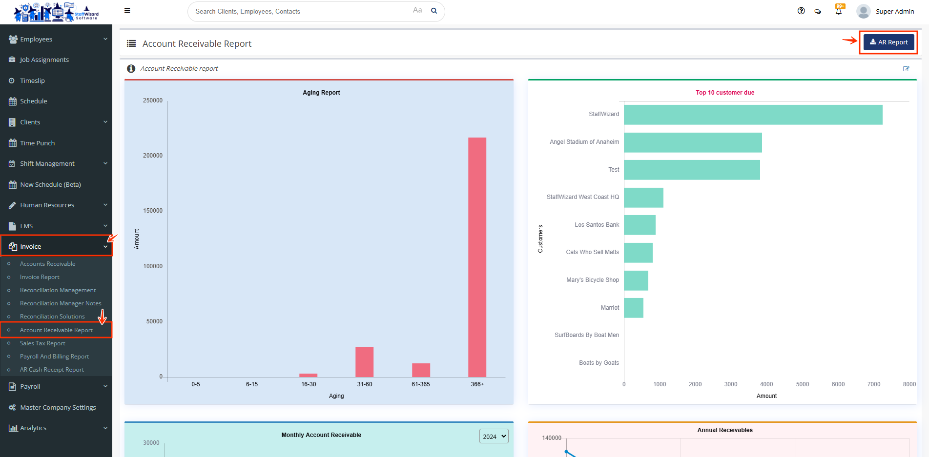 Go to the tab "Invoice", you will see the option "Accounts Receivable Report"; open the tab and you will see the button "AR Report", click it and a chart will appear to set the filters for you to input the information desired for the system to build the report.