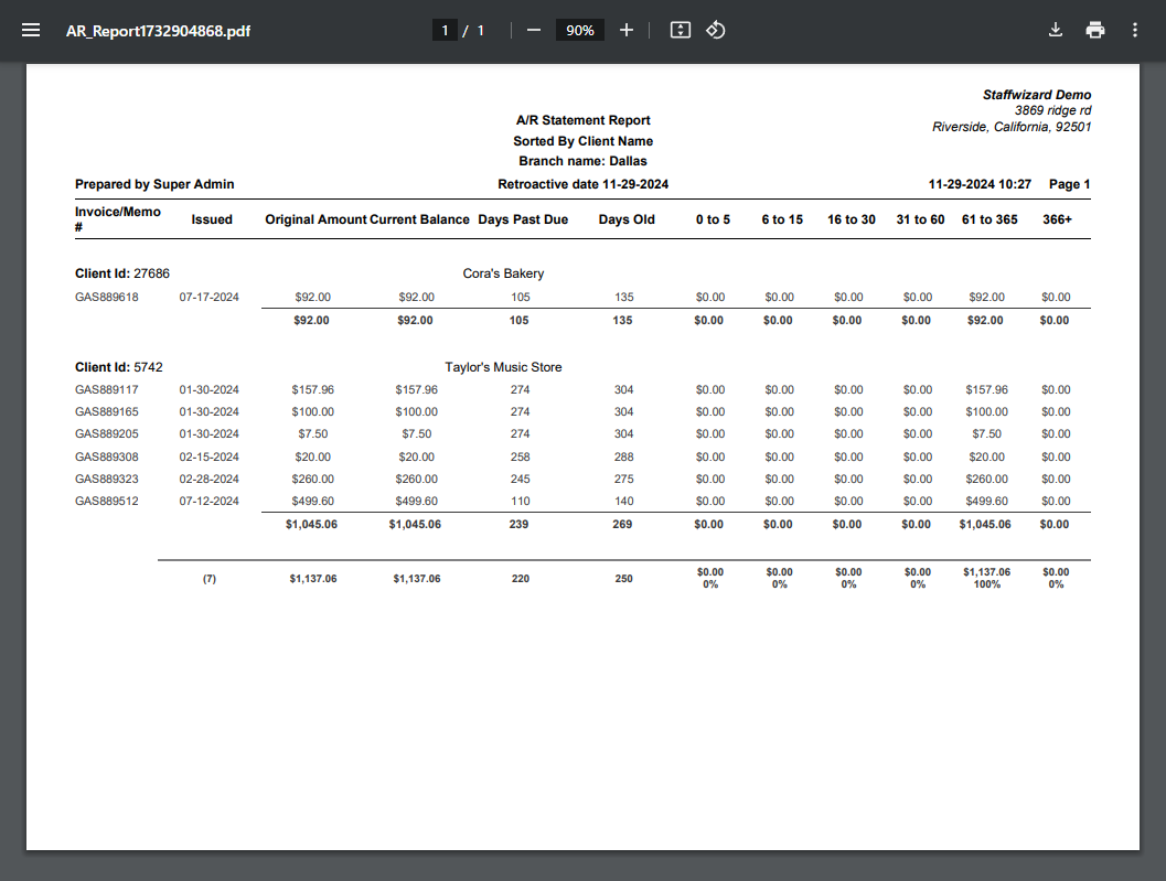 The Accounts Receivable Report provides detailed invoicing information to help businesses manage cash flow and evaluate financial performance. This report gives an overview of amounts owed, payments received, and aging details for overdue invoices. It includes the following details: