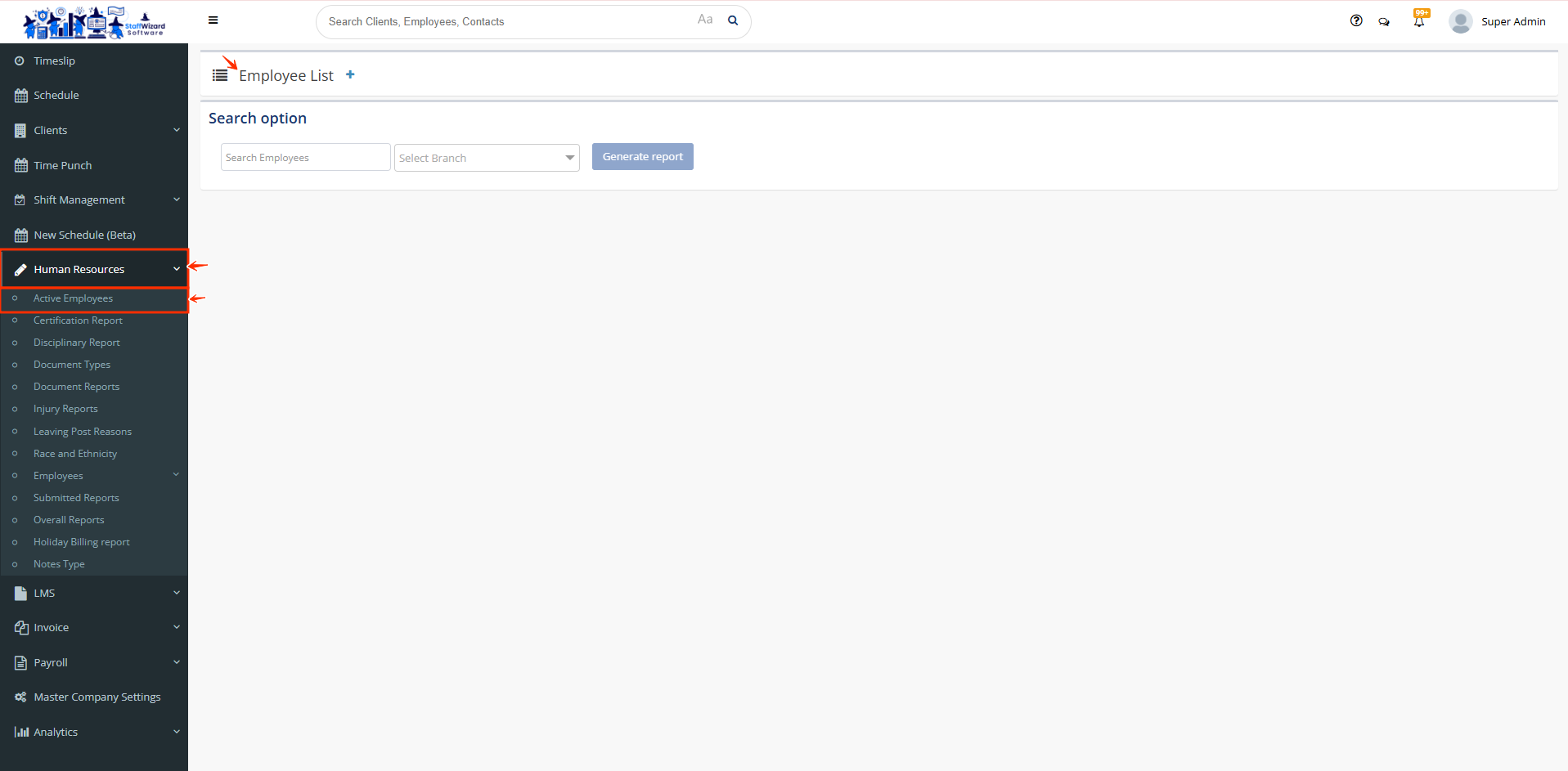 - Employee Search = Leaving this blank will generate all employees or you can specify certain employees