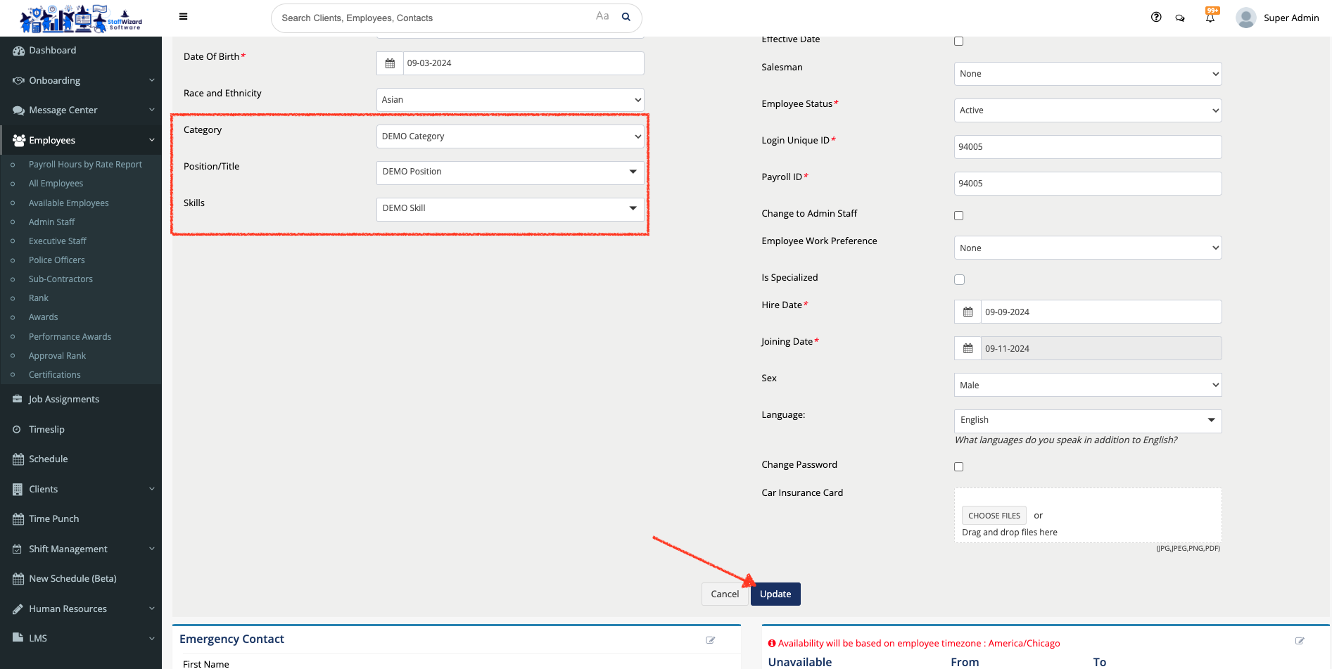 - Navigate through the employee's general information until you find the labels "Category", "Position/Title" and "Skills". On each box select the option that you need, then hit the [Update] button to save the changes.