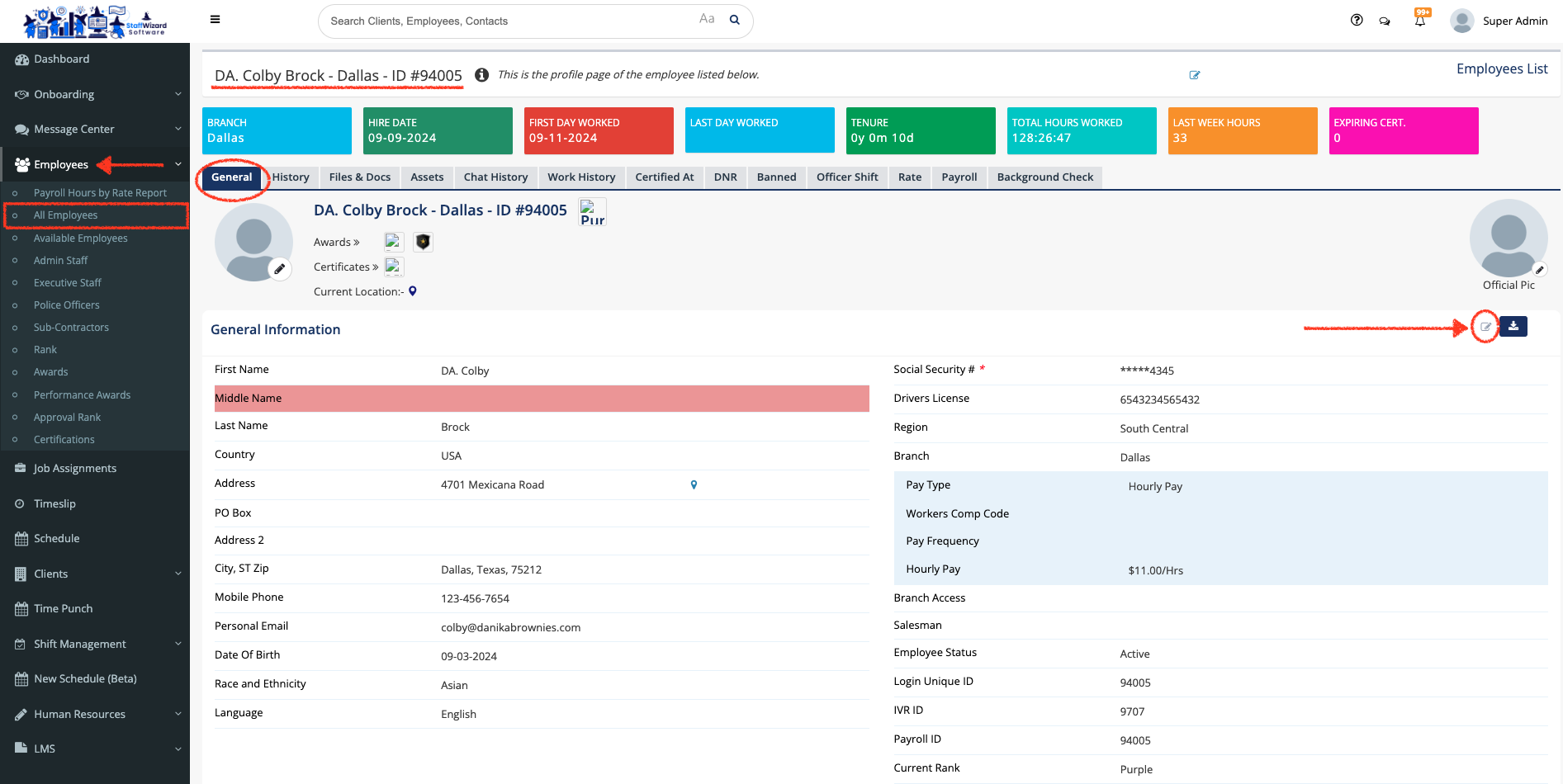- Go to the 'Employees' tab on the main menu on the left-hand side of the StaffWizard page, and select the "All Employees" option. Then locate the employee that you need by using the filters or navigating the list.