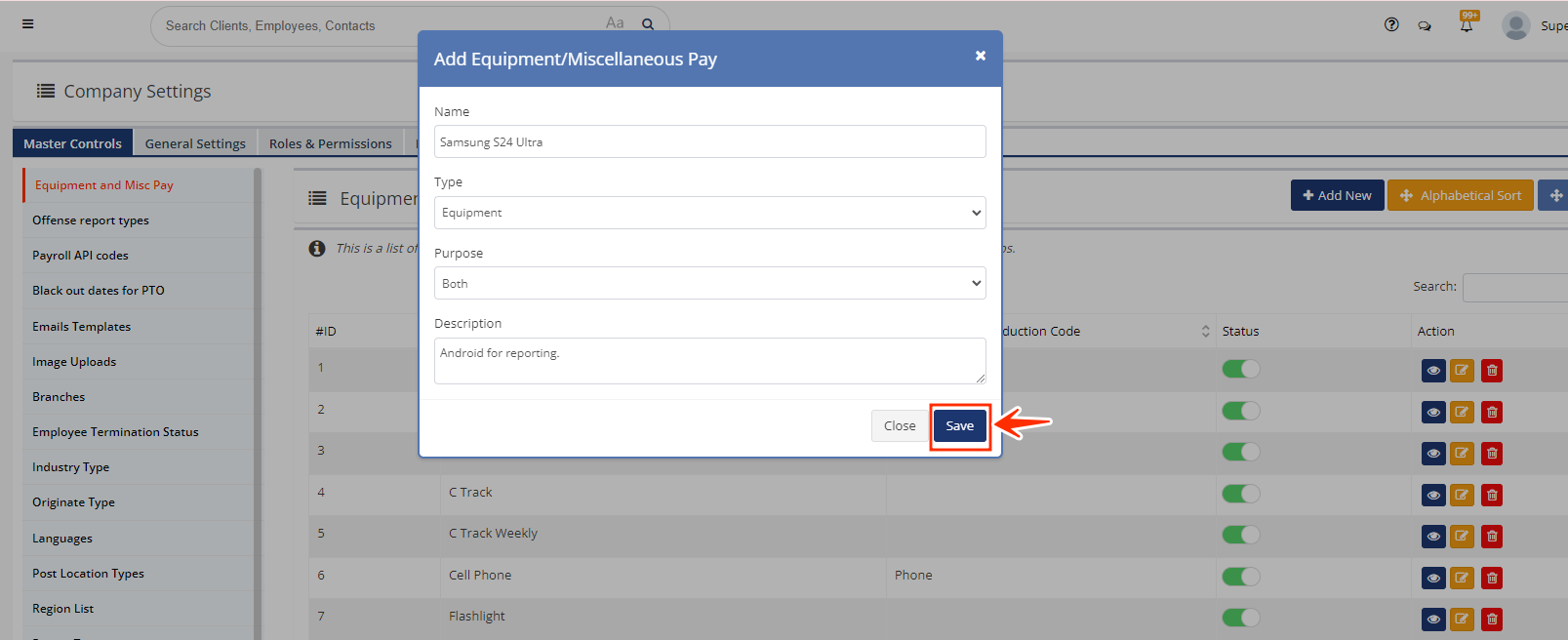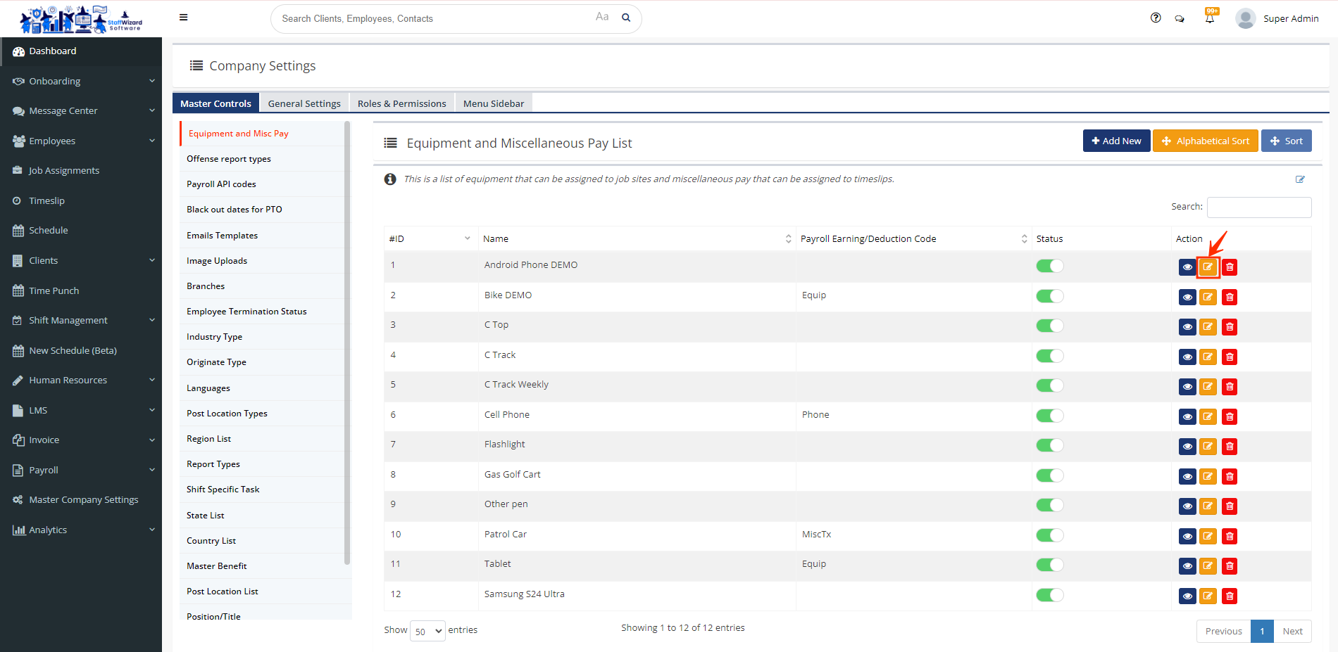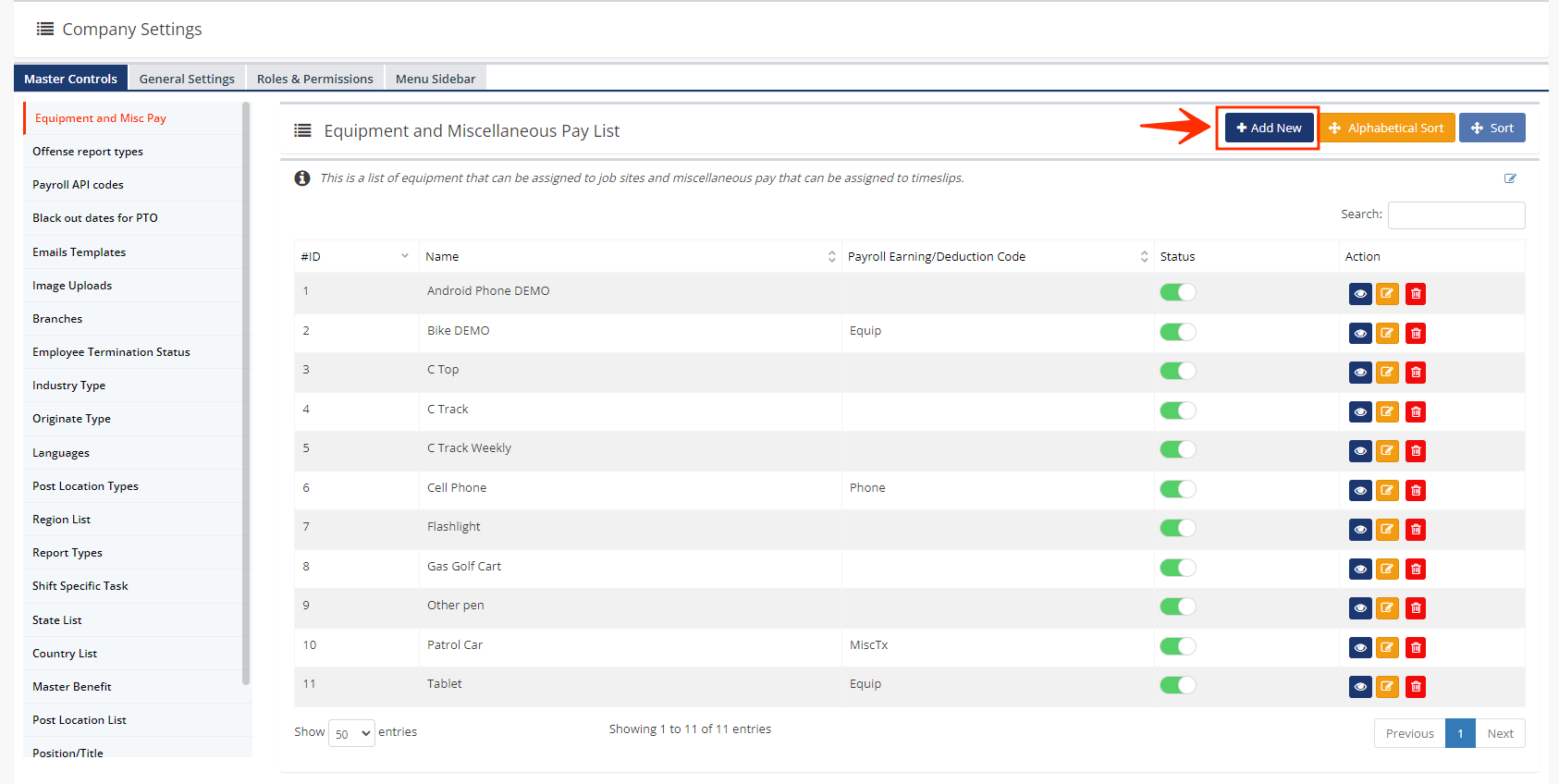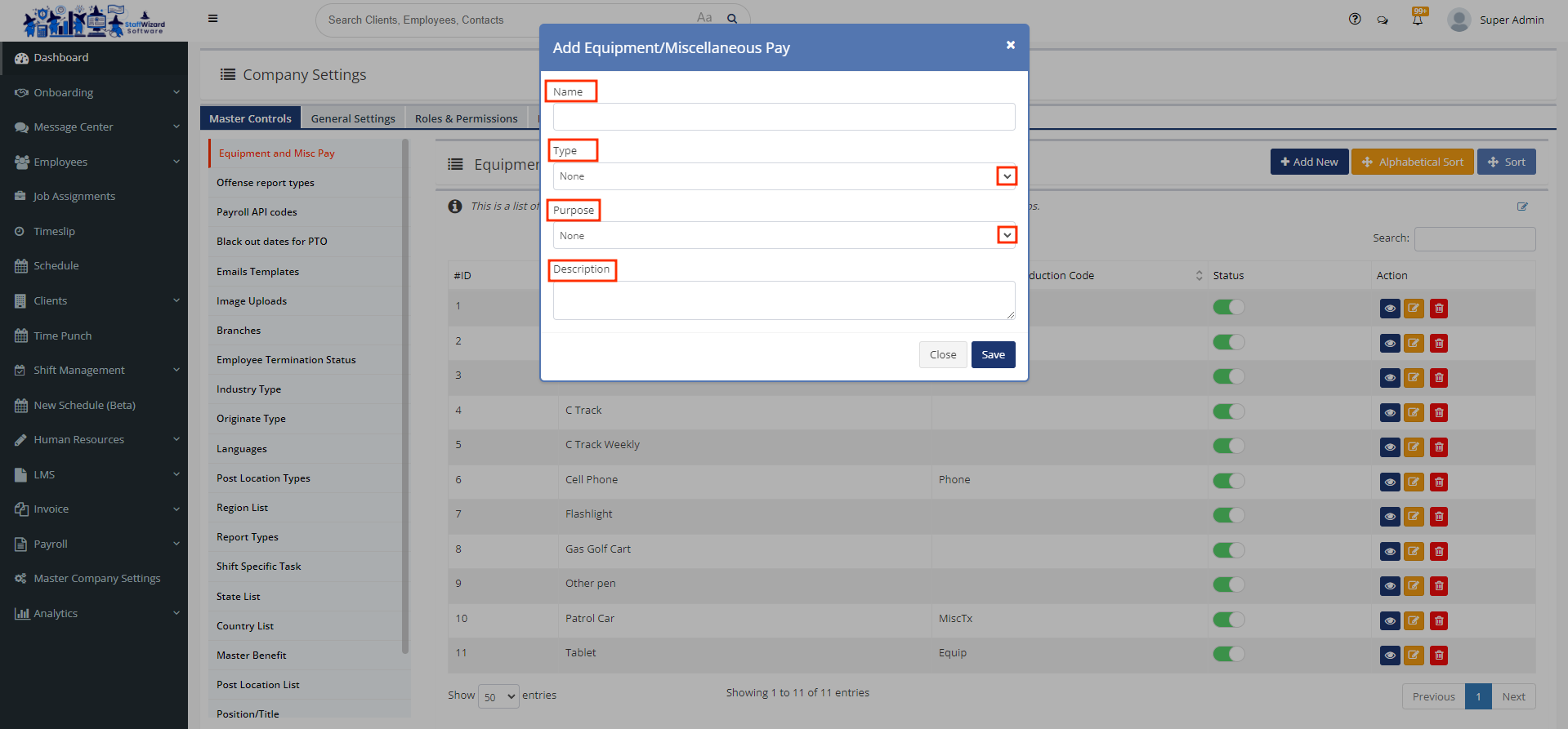 On the main menu on the left-hand side of your Staffwizard page, click on the"Master Company Settings" tab, select the "Master Controls" section that is displayed on the left-hand side of the screen, then click on "Equipment and Misc Pay" on the tab on the top of the panel.