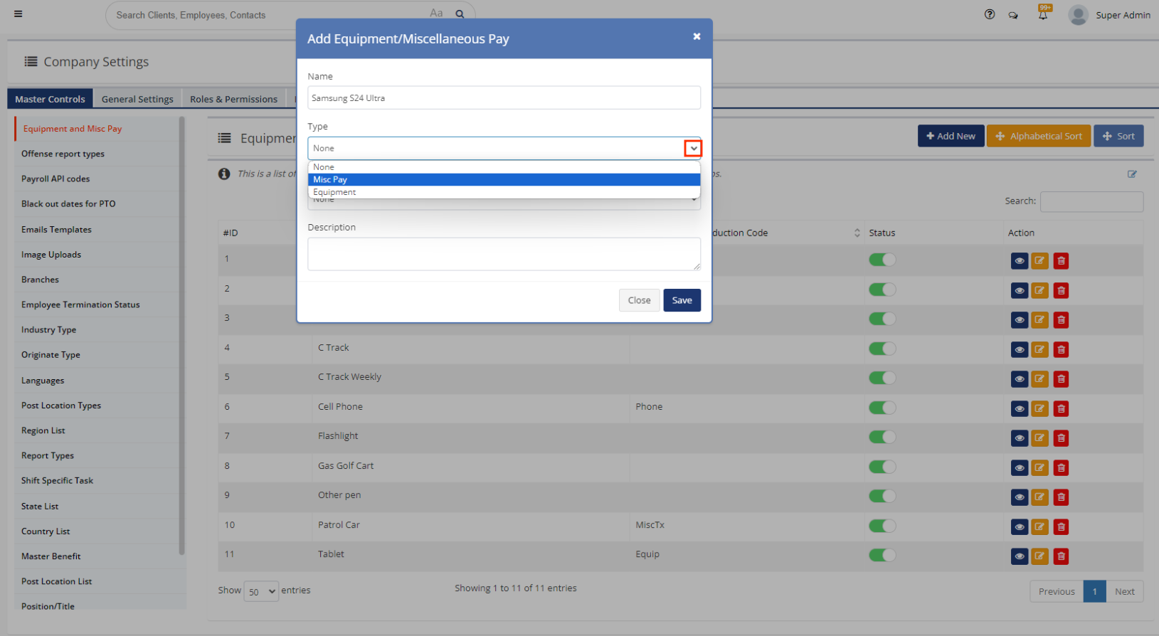 - For the field "Type" you can select if it is "Miscellaneous Pay" or "Equipment".