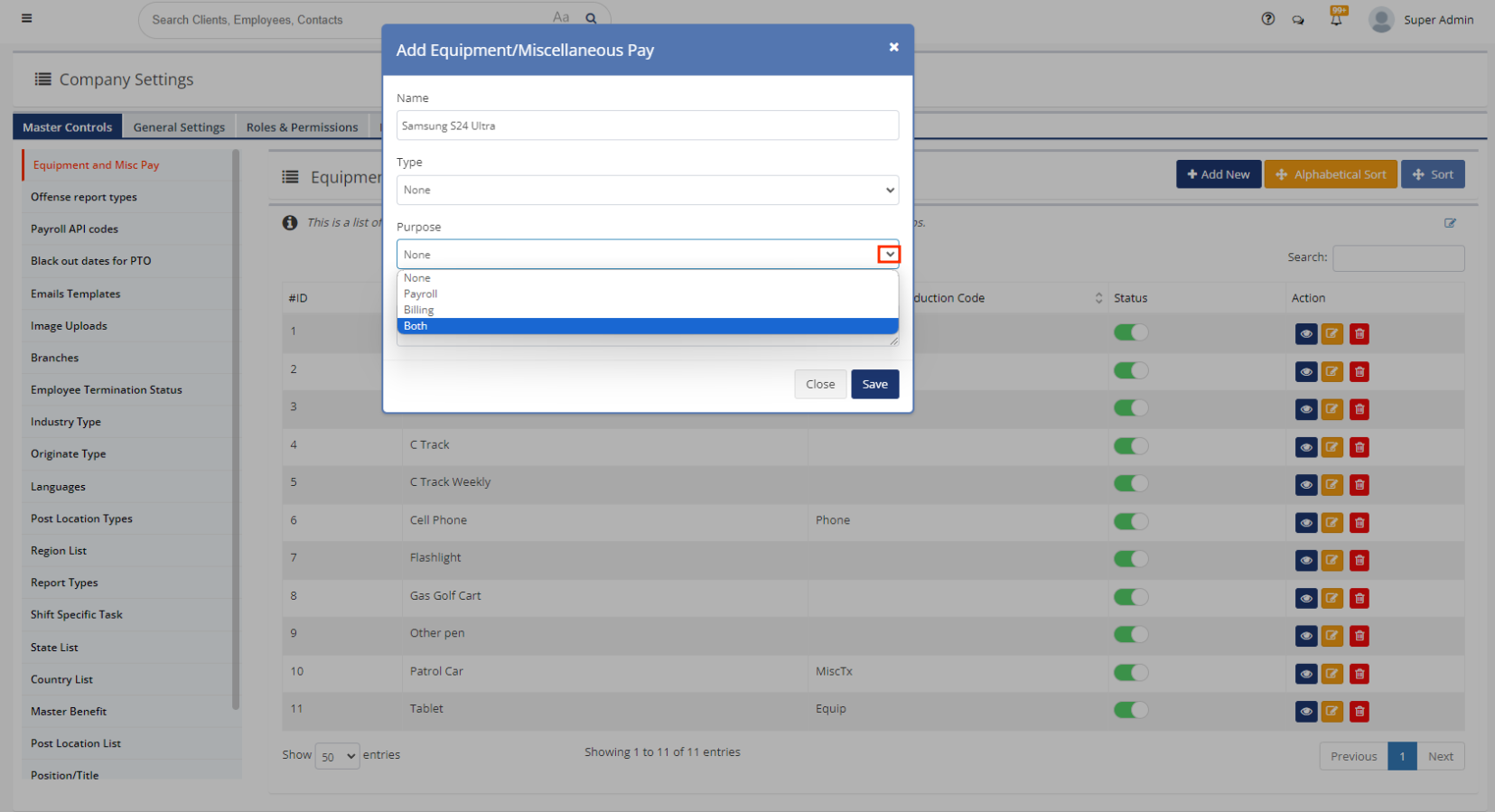 - For the field "Purpose", you will be able to choose from "Payroll", "Billing" or "Both" depending on the uses of the item you are adding.