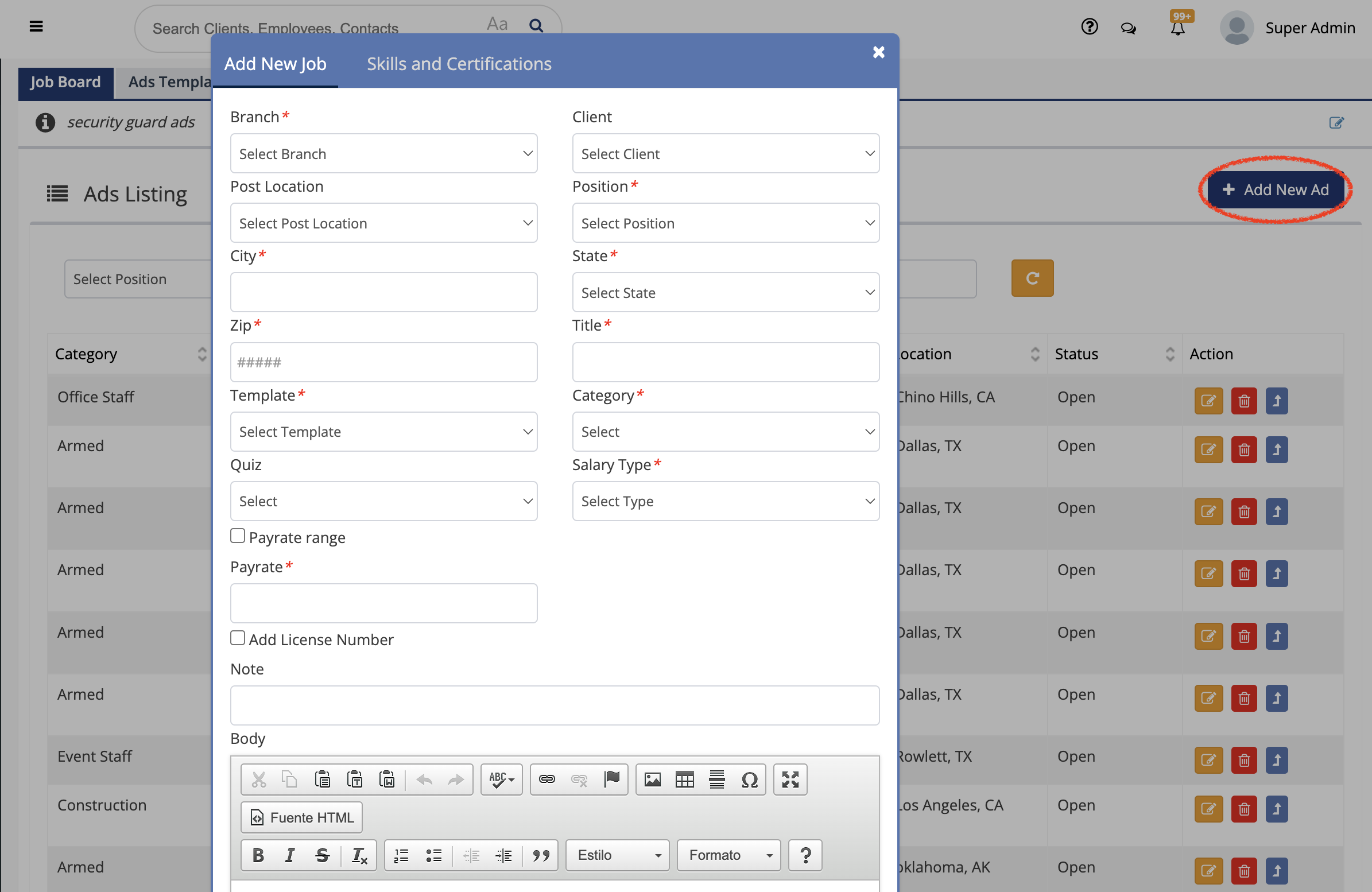 - When editing a previous ad or creating a new one, a pop-up window will open and you can assign a title or rephrase the existing title. Then you can start typing out the body of the ad template. This would be information about the job posting.