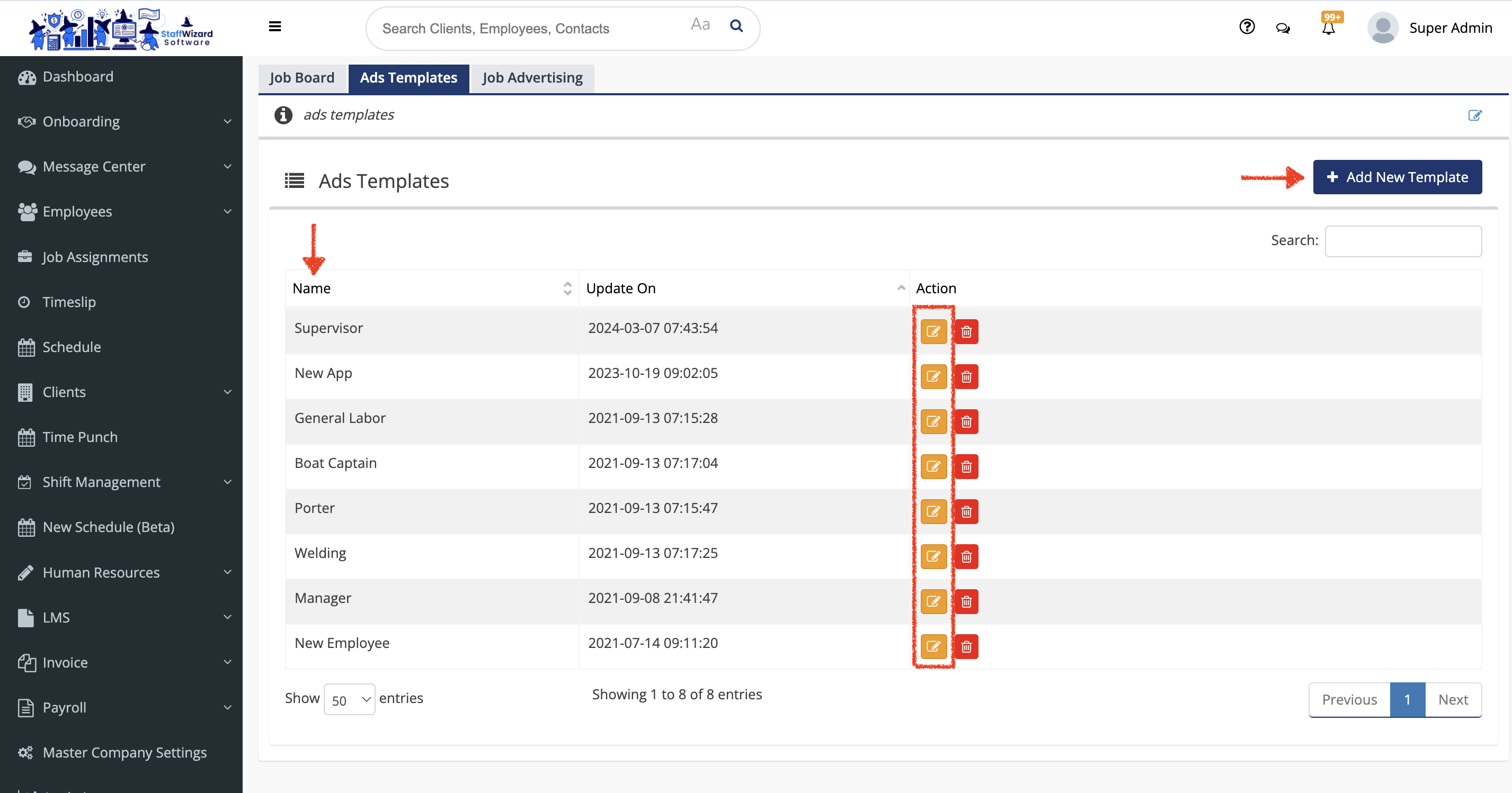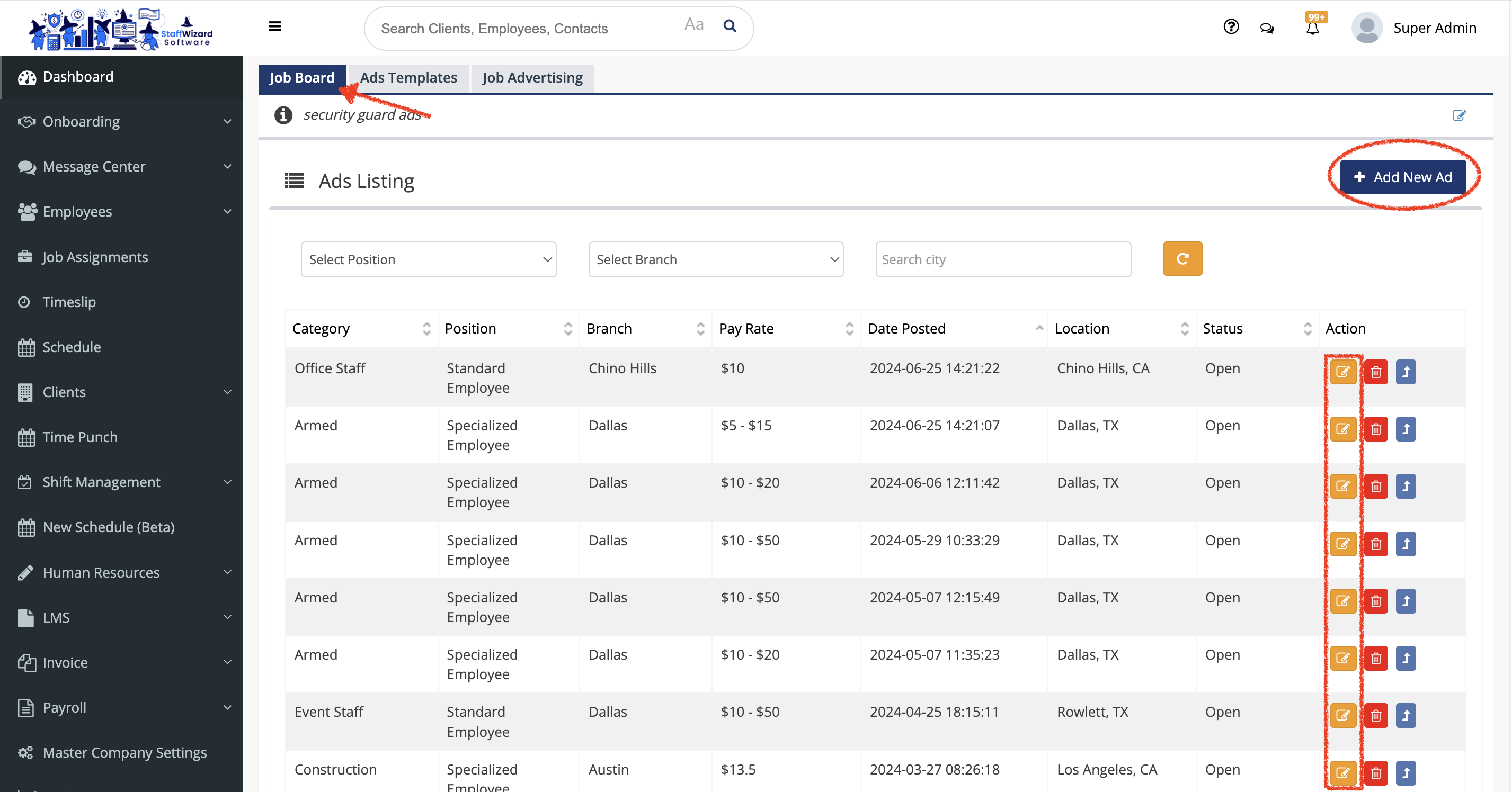 - On the main menu on the left-hand side of the StaffWizard page, under the 'Onboarding' tab, navigate to "Manage Jobs Ads".