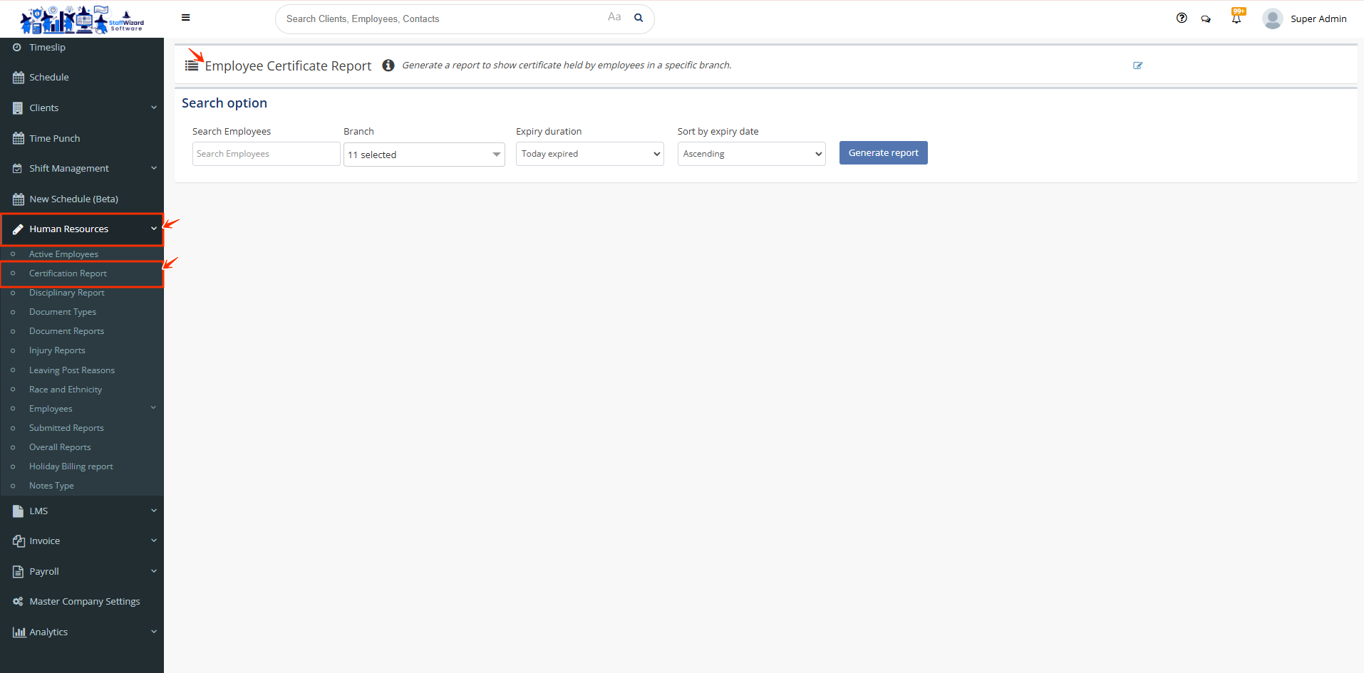 If you are seeking to create an Active Employees Report, click the tab "Human Resources", you will see the option "Certification Report"; open the section and you will see the filters for you to input the information desired for the system to build the report.
