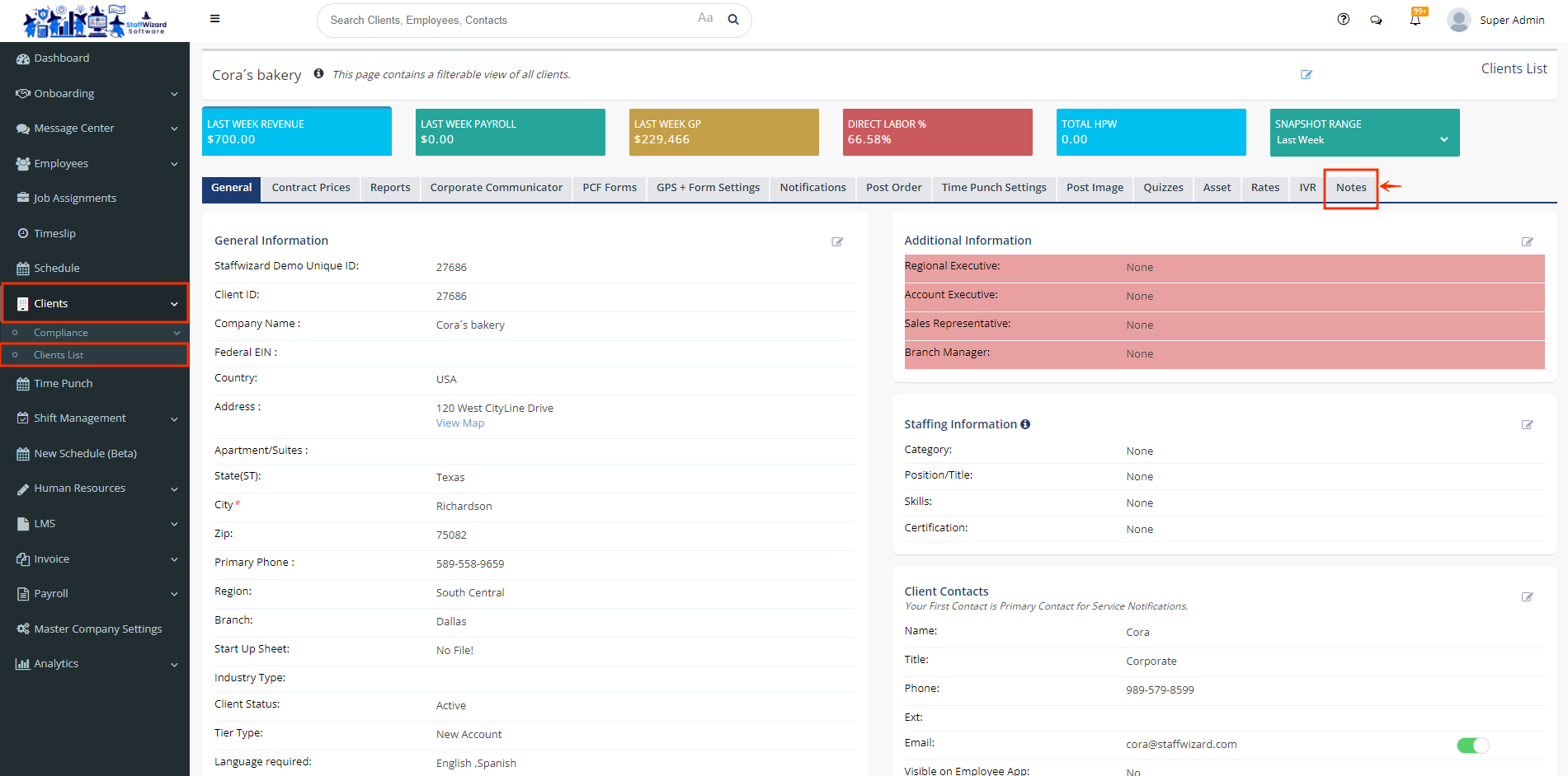 - Once you have selected the client you desire, open the client´s profile and click the section "Notes".
