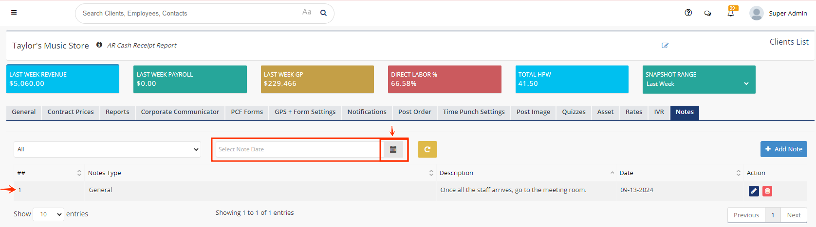- You will see the note listed but also you can use the filters to search the notes per date.