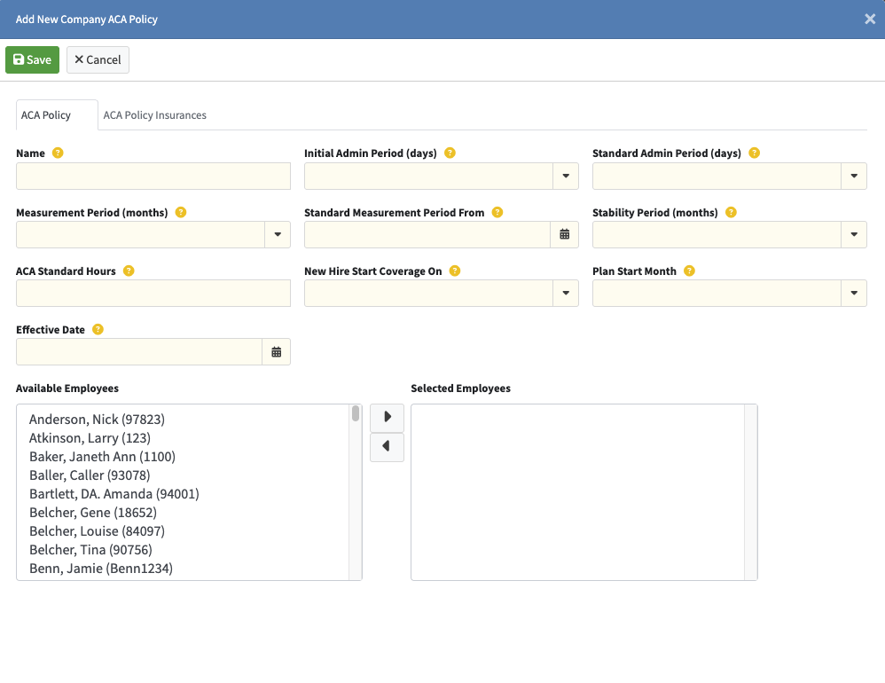 ACA Policy Tab- The fields on this page define the behavior of the ACA Policy and set ACA code overrides for ACA reports (1095-C and ACA Preview). The overrides are defined on the ACA Policy Insurances tab.