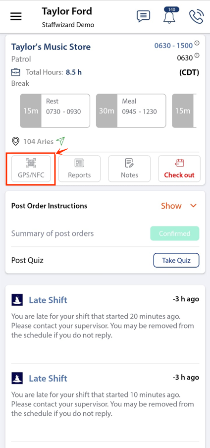 - While in the 'Current' shift view, select the 'GPS/NFC' button.