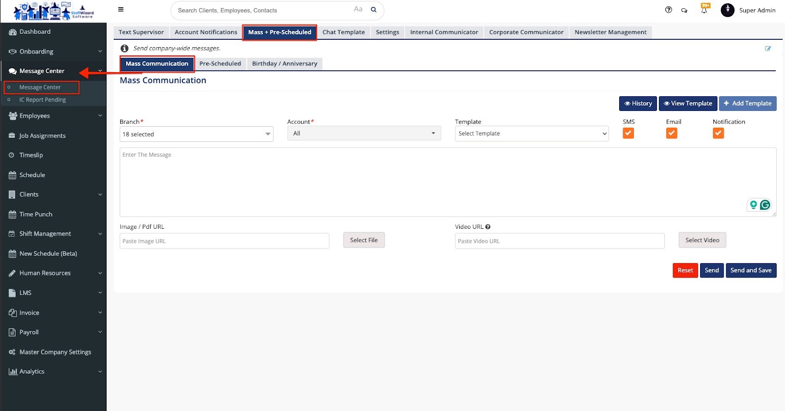 On the new page, click on ‘Mass + Pre-Scheduled’ and then choose ‘Mass Communication.’ This will take you to the Mass Communication screen.