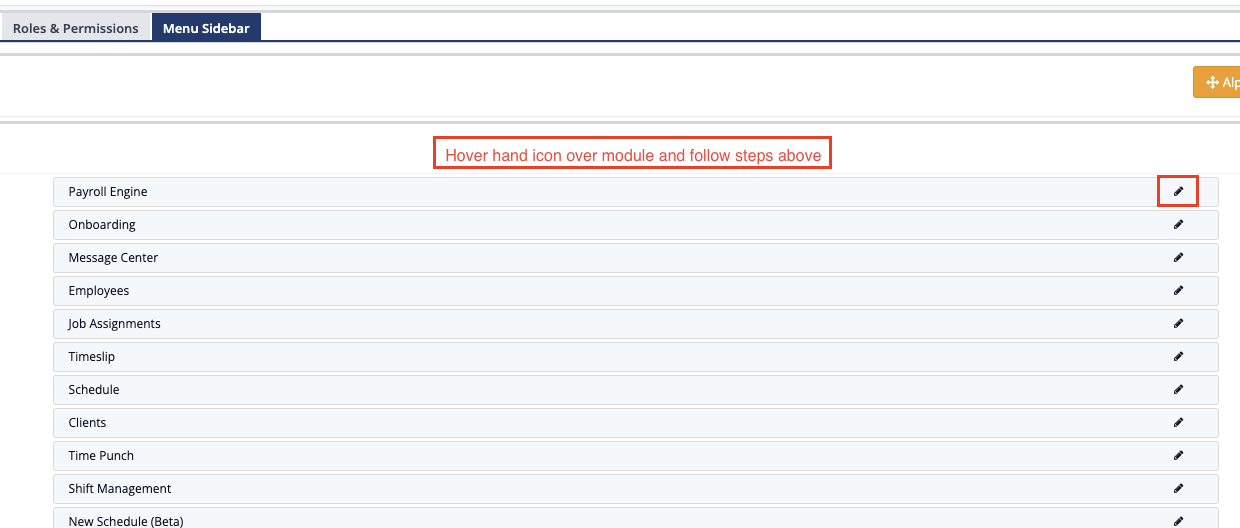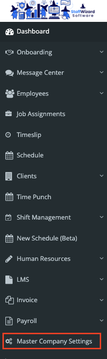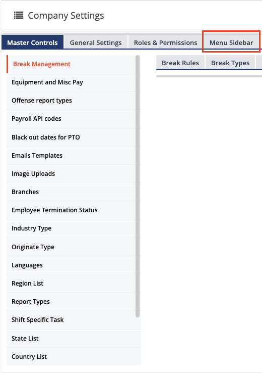 Locate the “Master Company Settings” module on the left side panel and select the Menu Sidebar Tab.