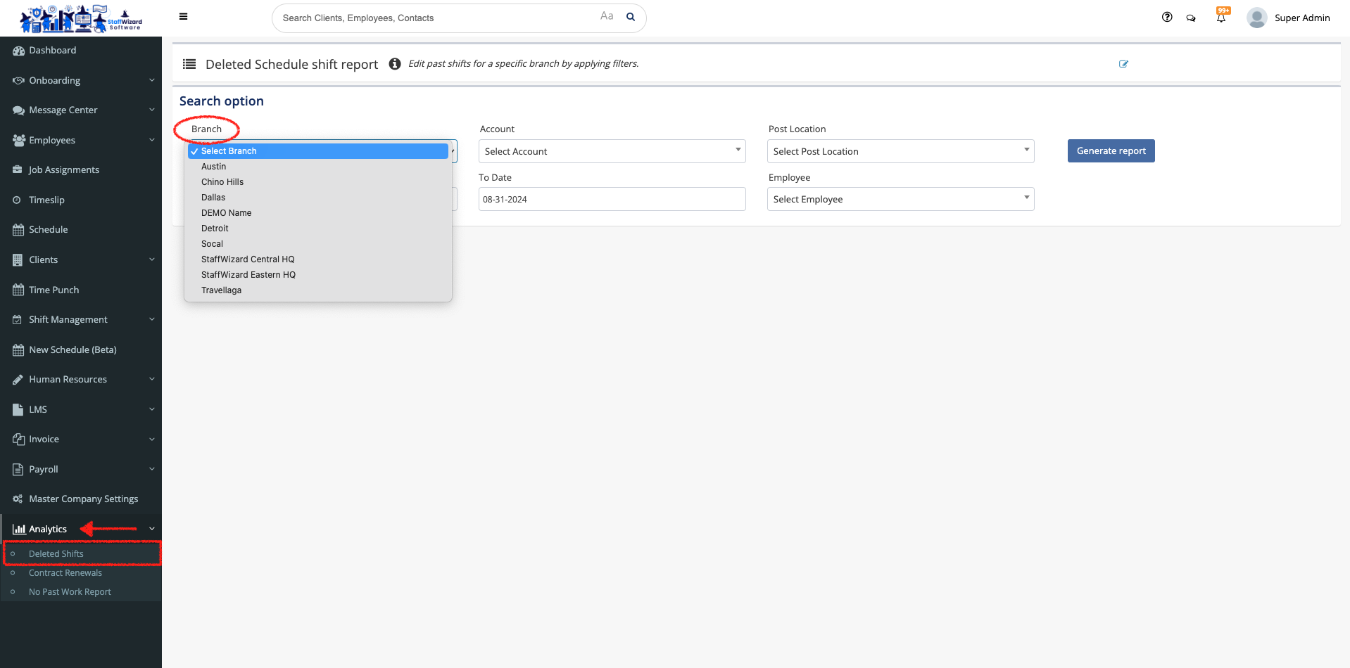 Go to the 'Analytics' tab on the main menu on the left-hand side of the StaffWizard page, and select the "Deleted shifts" option.