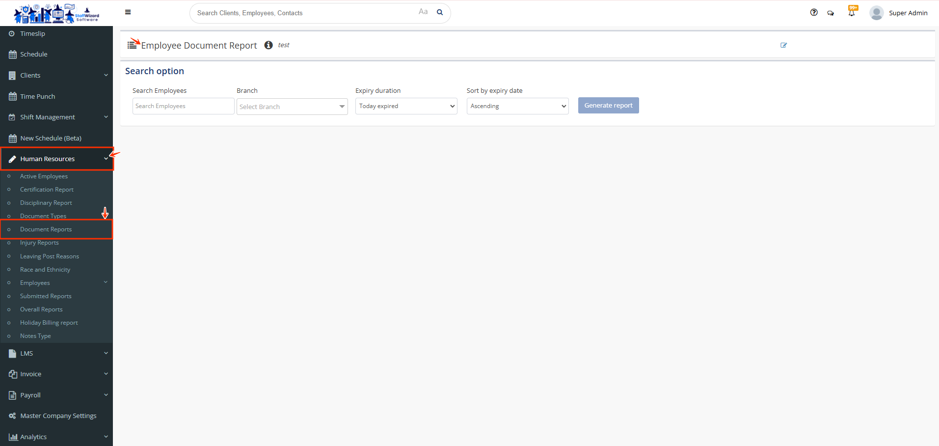 If you are seeking to create an Active Employees Report, click the tab "Human Resources", and you will see the option "Document Reports"; open the section and you will see the filters for you to input the information desired for the system to build the report.