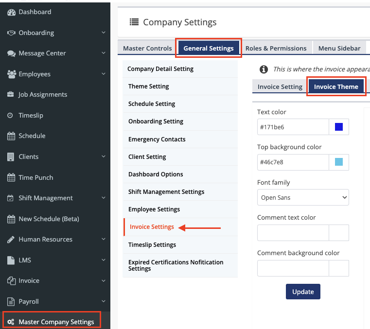 - Navigate to Master Company Settings > select the General Settings > and the scroll down to locate Invoice Settings, > click on Invoice Theme.