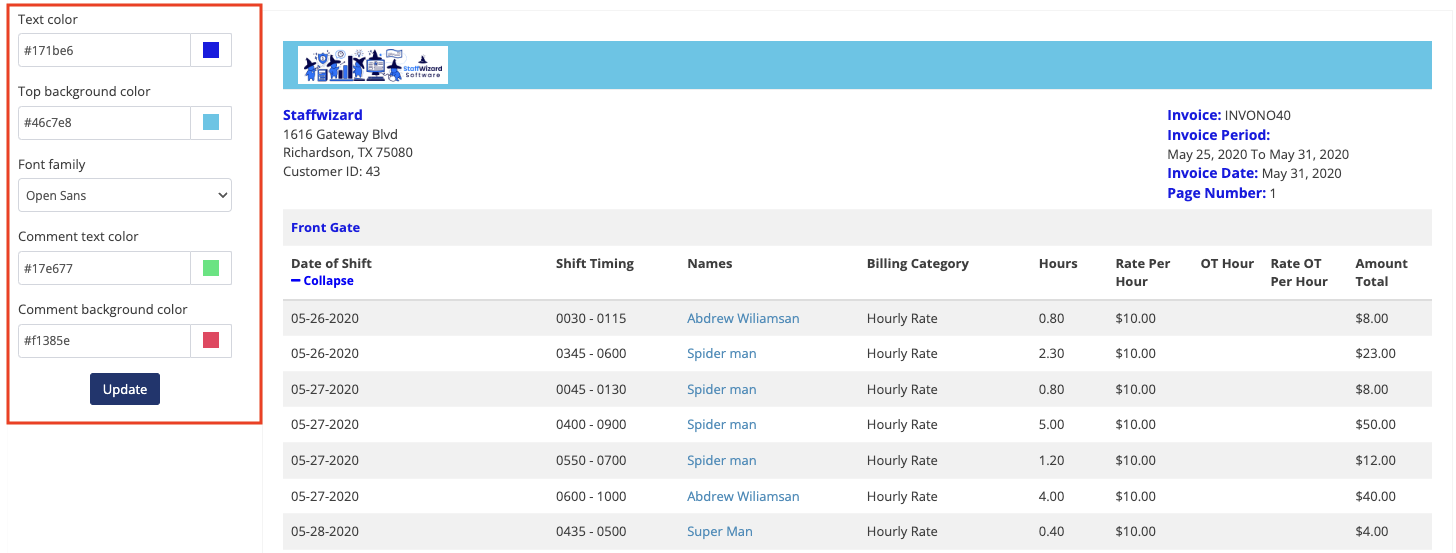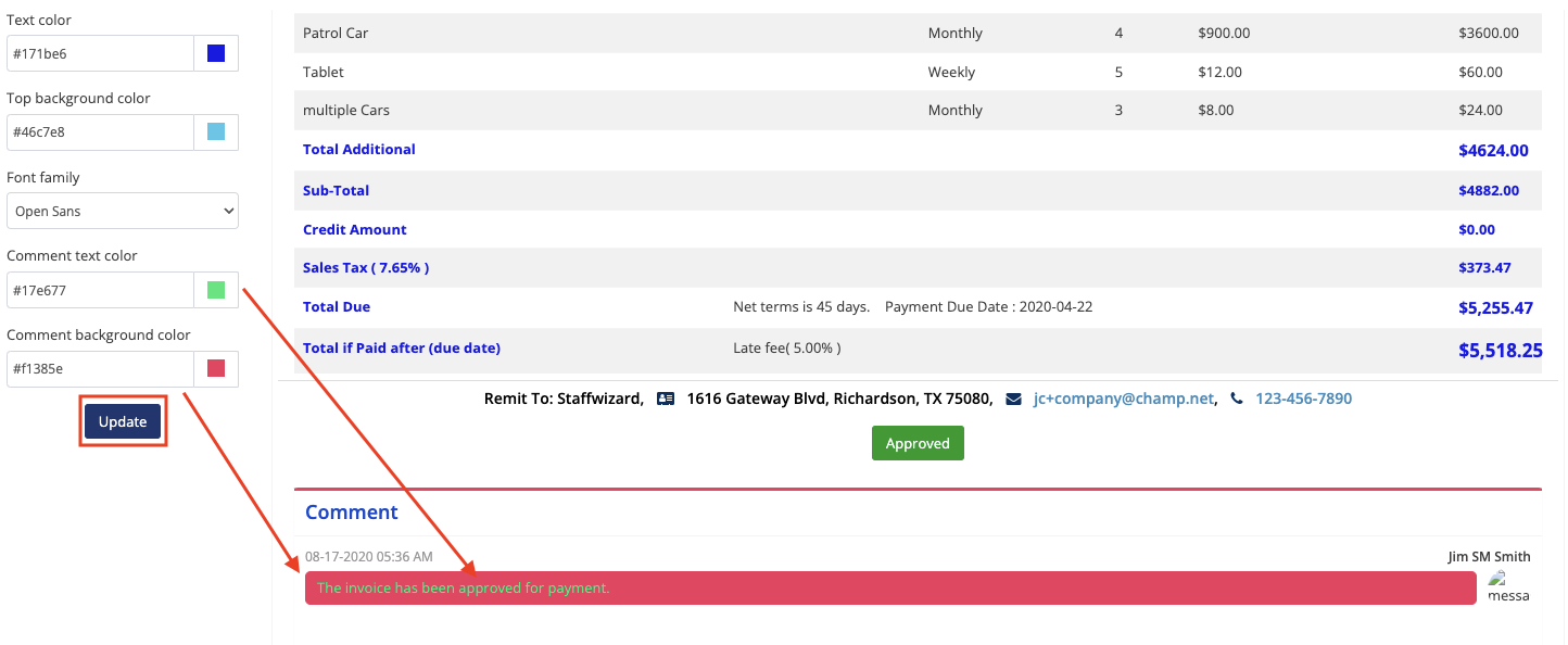 To preview the customization of the Comments section, scroll to the bottom of the invoice preview. Press Update to save changes.