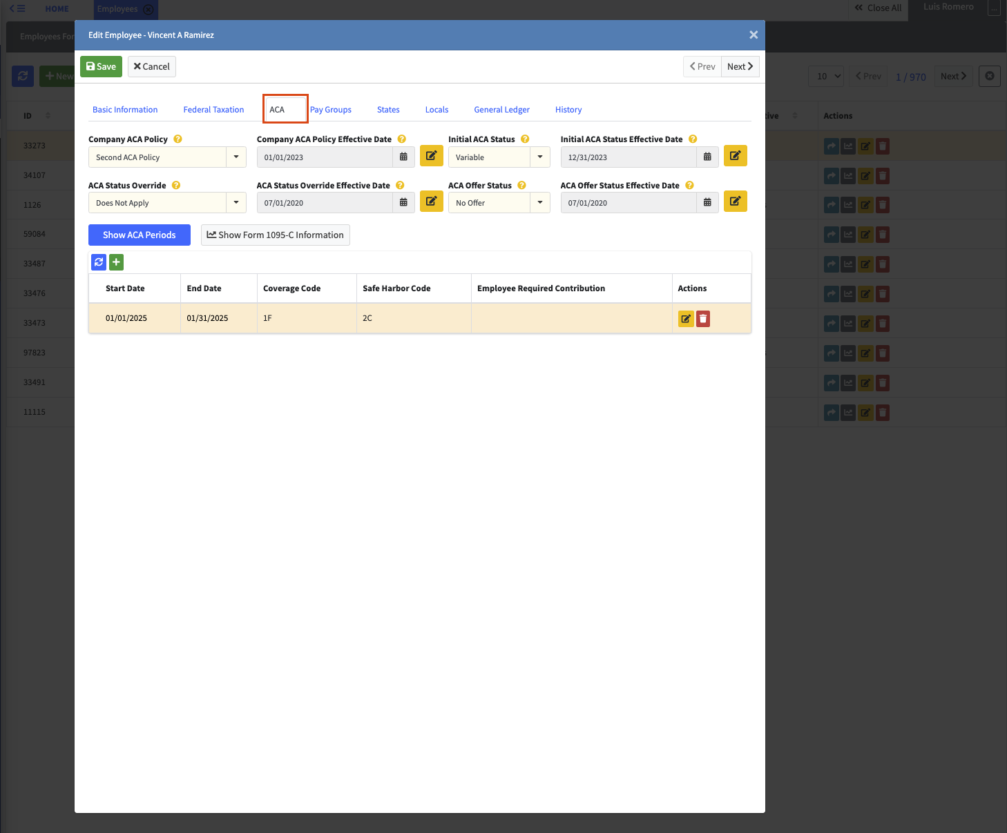 - Select the yellow [Pencil] button on the desired employee, and select ACA tab.