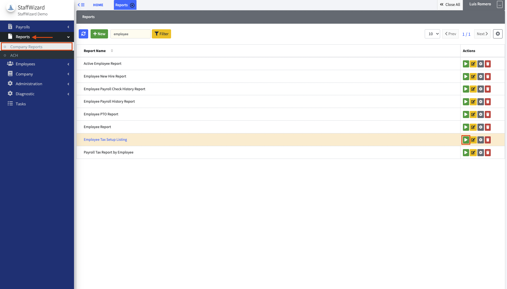 To generate the Employee Tax Setup Listing Report, navigate to the 'Reports' Module and click "Company Reports". Locate the desired report and click on the green [Play] button to proceed.