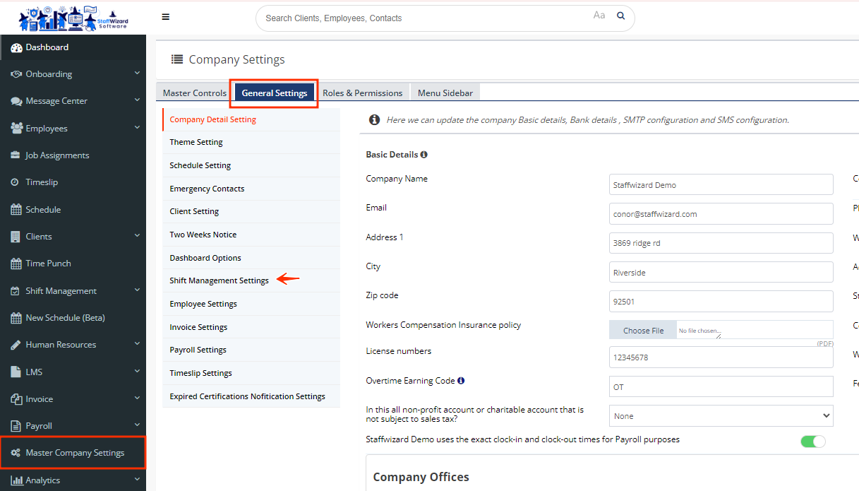 - Click "Shift Management Settings" and then, select "Auto Shift Management Settings". Locate the title "Out of geo-fencing" and enable the "status". Make sure to have the sections Mail, SMS, and APP enabled so the supervisor gets notified.
