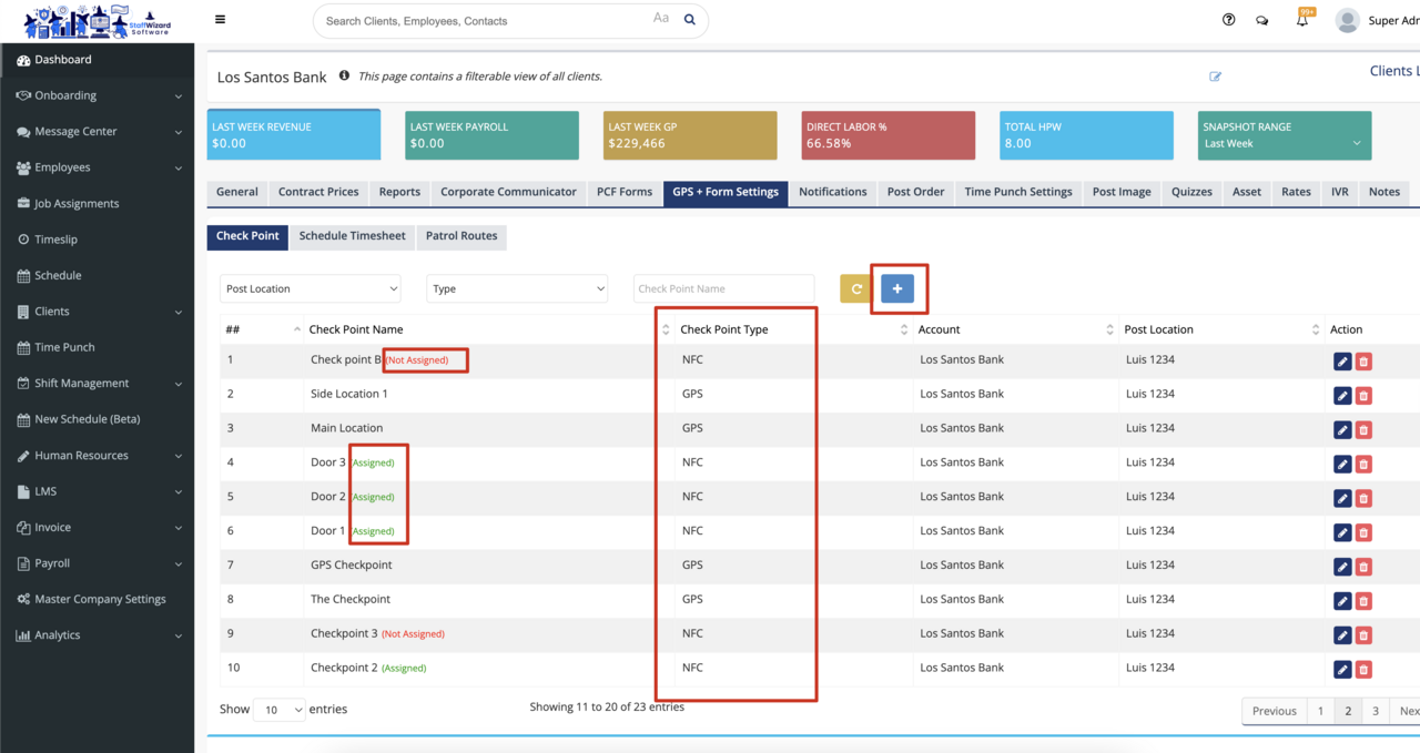The default landing area is the Checkpoint module that allows you to add GPS, NFC, or QR code-based checkpoints by pressing the blue '+' button. NFC tag-based checkpoints will be shown as Unassigned in red until they are assigned using the StaffWizard Post Location App.
