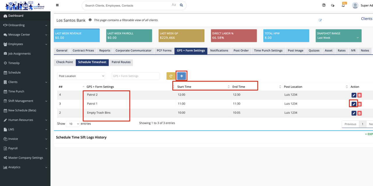 The Schedule Timesheet tab is where users can define activities to happen throughout multiple sets of shifts. For example, at the defined task start and end time the user will be alerted "Start Task Take Out The Trash" and at the end time "Task Take Out The Trash Has Ended" will be shown.