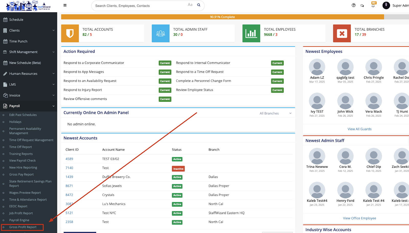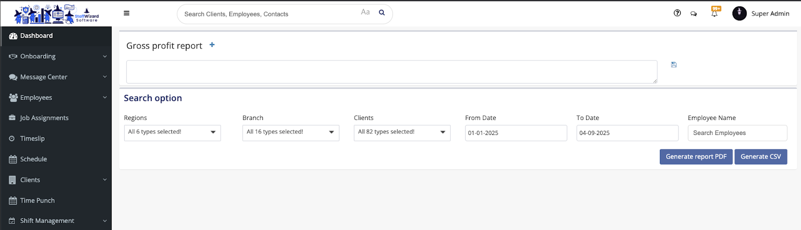 The Gross Profit Report can be found under the Payroll tab near the bottom of the page. This report calculates your gross profit by taking the billable hours and any billable items linked to posts, then subtracting the payable hours and their associated gross pay.