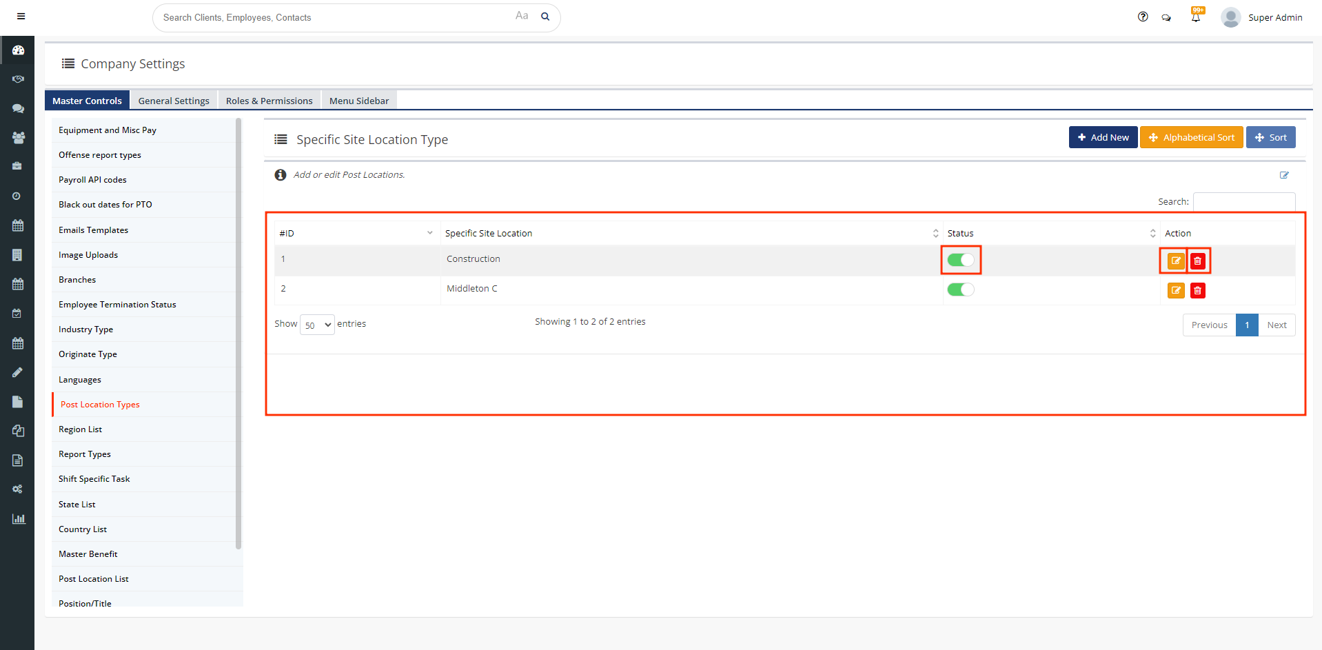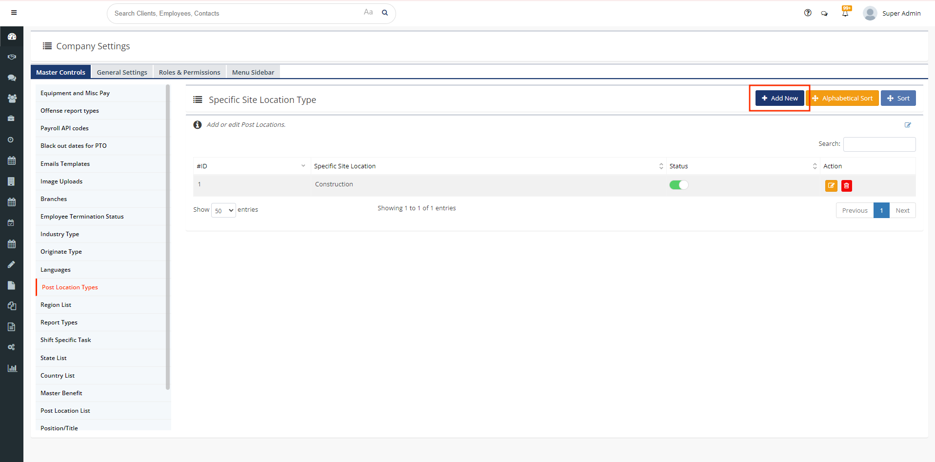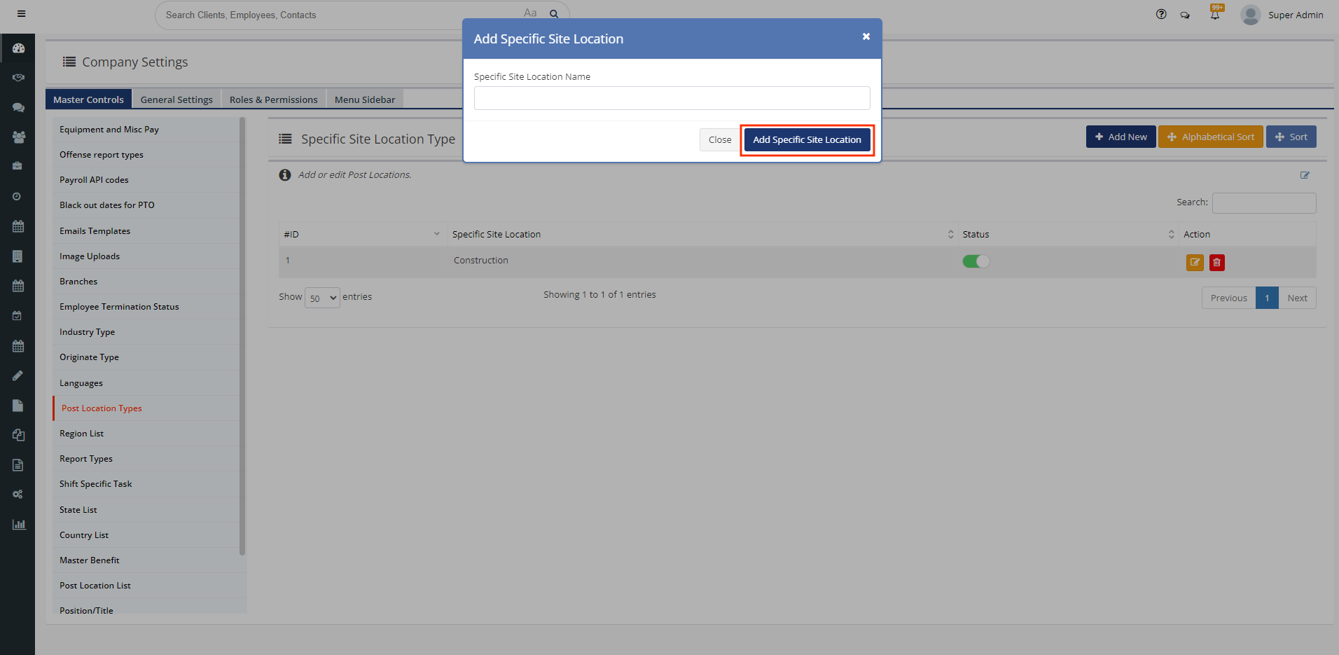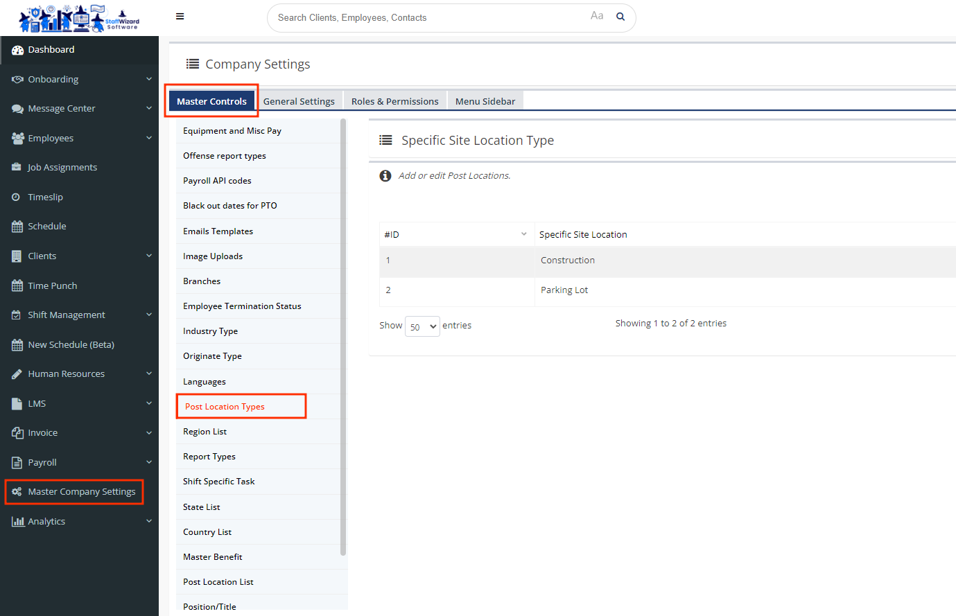 - On the main menu on the left-hand side of your Staffwizard page, click on the"Master Company Settings" tab, and select the "Master Controls" section that is displayed at the tab on the top of the panel, from here you will see a tab called "Post Location Tab".