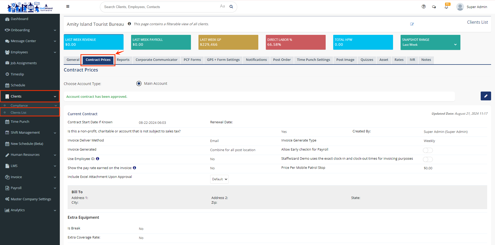 - Go to the "Clients" tab, select the section "Clients list" and use the filter to look for the Client´s profile you want to edit. Once you open the general information of the Client´s profile, click the tab "Contract Prices".