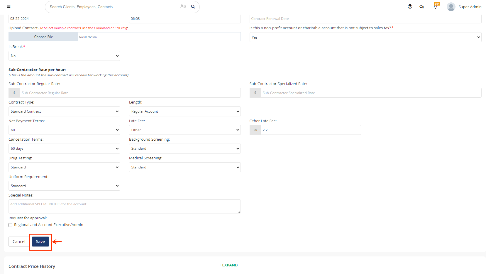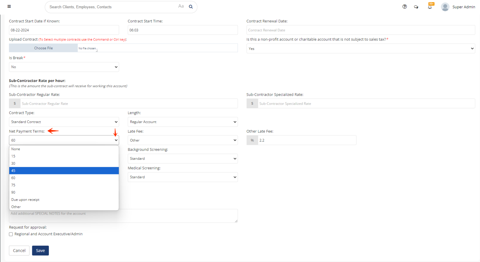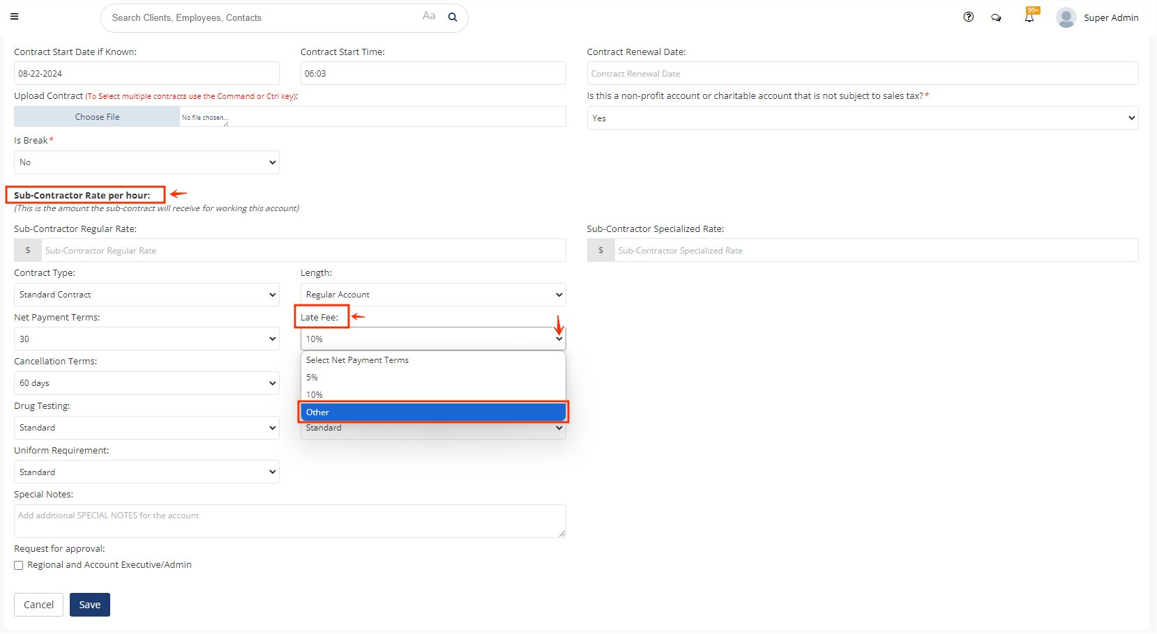 - The system will scroll down the page and keep scrolling until you see the section "Sub-Contractor Rate per hour", locate the name "Late Fee" and select the option "Other".