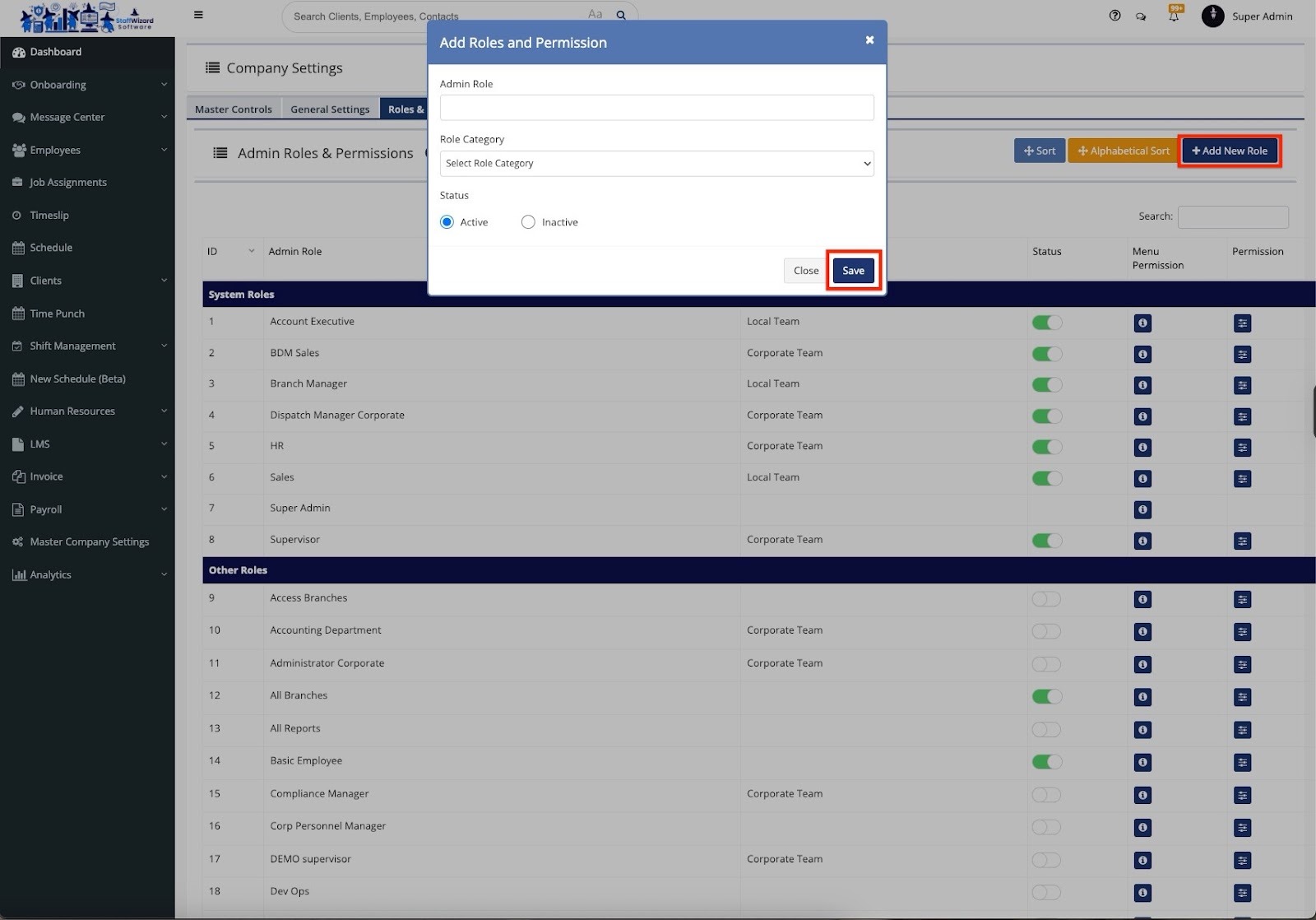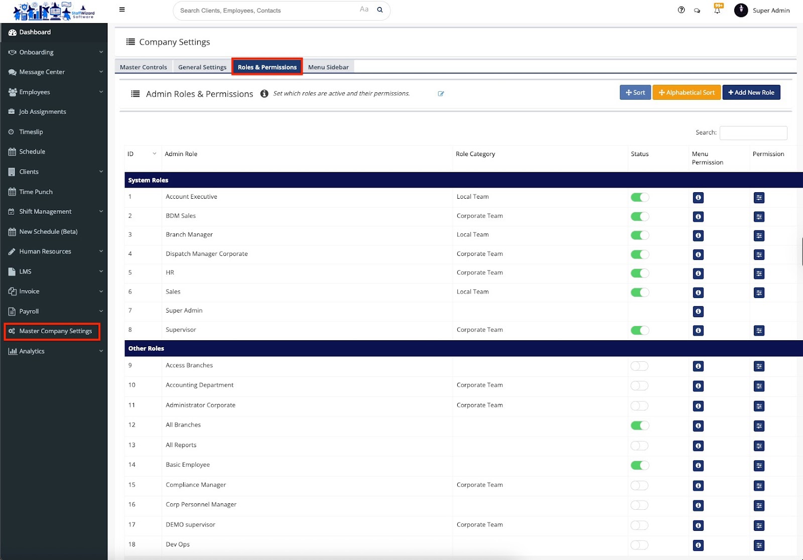 To add a new admin role with defined permissions. Navigate to the ‘Master Company Settings’ and click on the panel on the left ‘Roles & Permissions’.