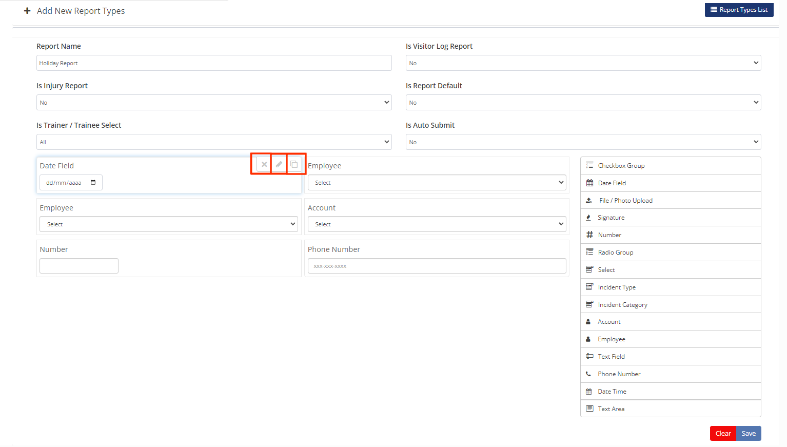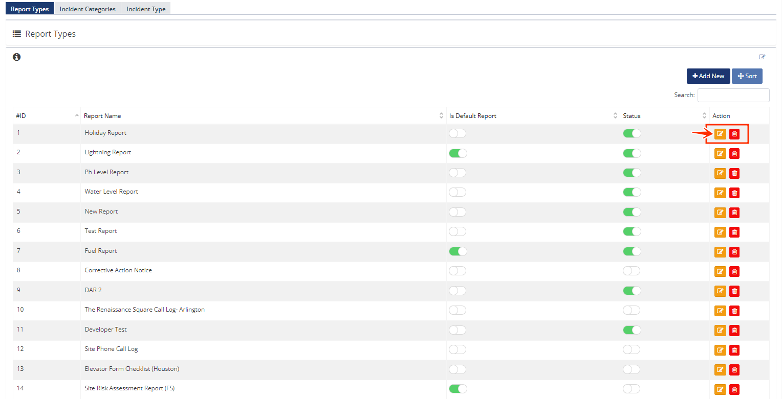 - In the same section "Report Types", a list of reports will display and you will see the option to edit or delete it in two buttons on the right-hand side of the list.