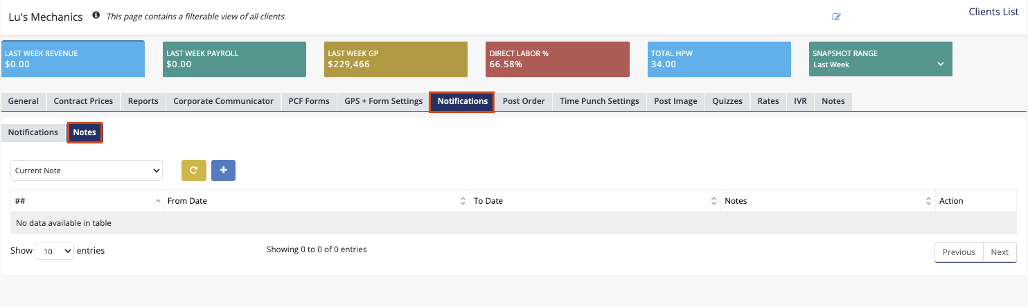From the main menu on the left-hand side, navigate the Clients module, click on "Client Lists", select the specific client for whom you wish to manage note communications.