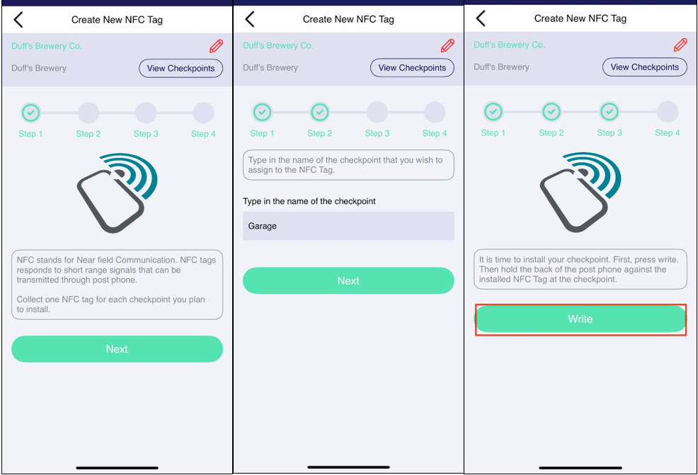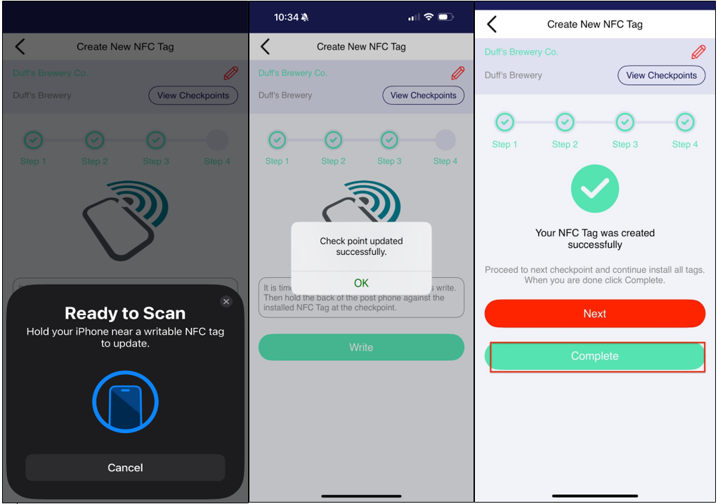 Step 3: Explains how to configure the NFC tag. Tap the "Write" button to begin scanning the NFC tag. Follow the instructions on this step, and once completed successfully, you will receive a notification confirming that the checkpoint has been updated.