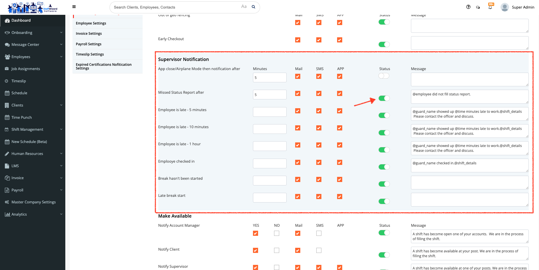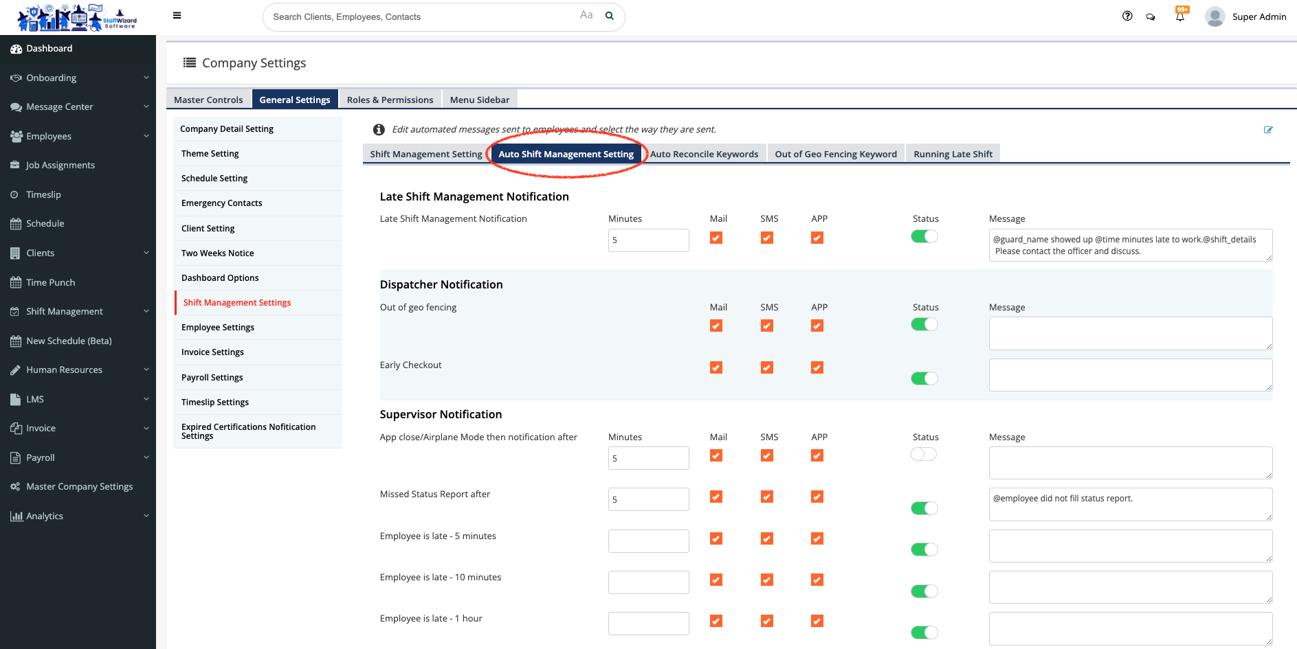 - On the new panel displayed, select the 'Auto-Shift Management Setting' tab, here you can set notifications for late shifts, and out-of geo fencing, among other features.