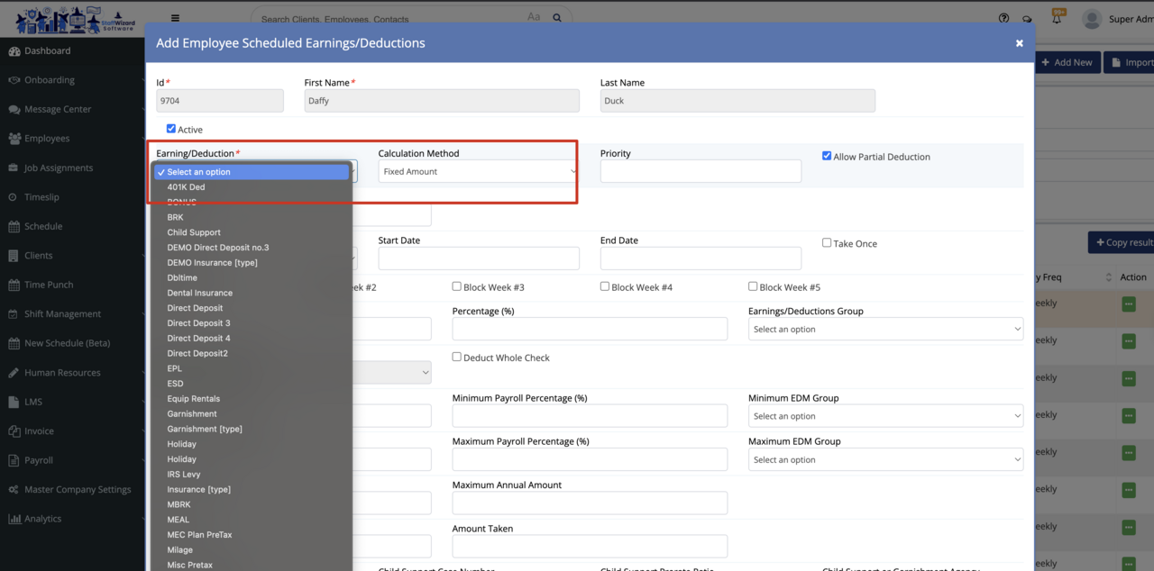 - When creating or editing a deduction, you will select the deduction type and then define how it should behave for that specific employee.