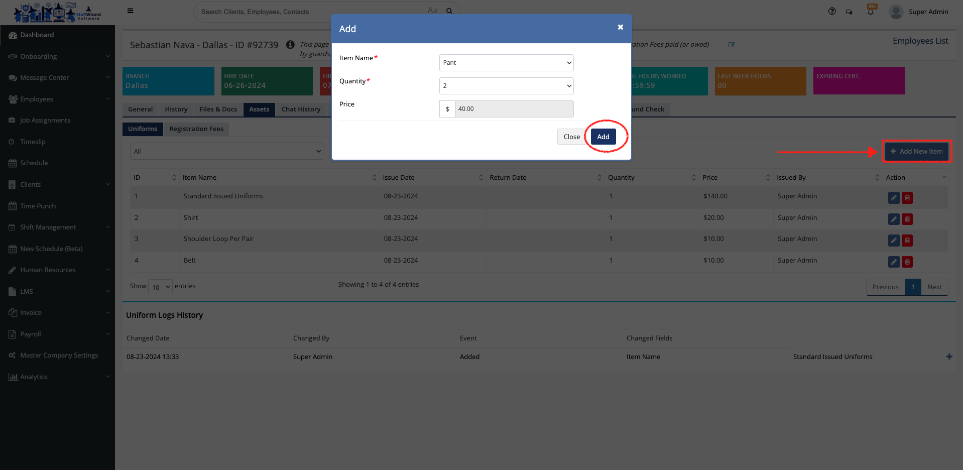 - On the employees's profile, go to the 'Assets' tab located at the top of the page. Then select the 'Uniforms' tab on the top of the new page displayed. Here you will be able to see all equipment given to the employee as well as new equipment including price and quantity.