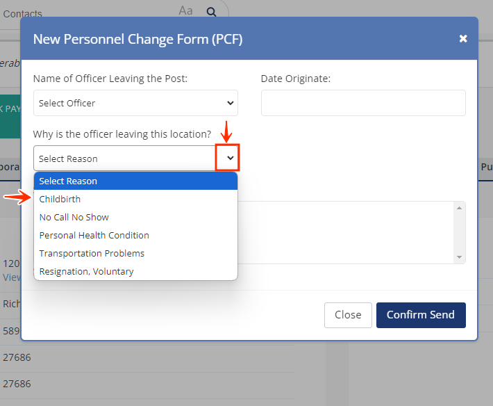 When you are adding a "Personnel Change Form(PCF)" but the reason why the officer is going to be out of the Post Location doesn´t match with the option populated, you can read the following article to see how to add a new one or edit the existing ones.