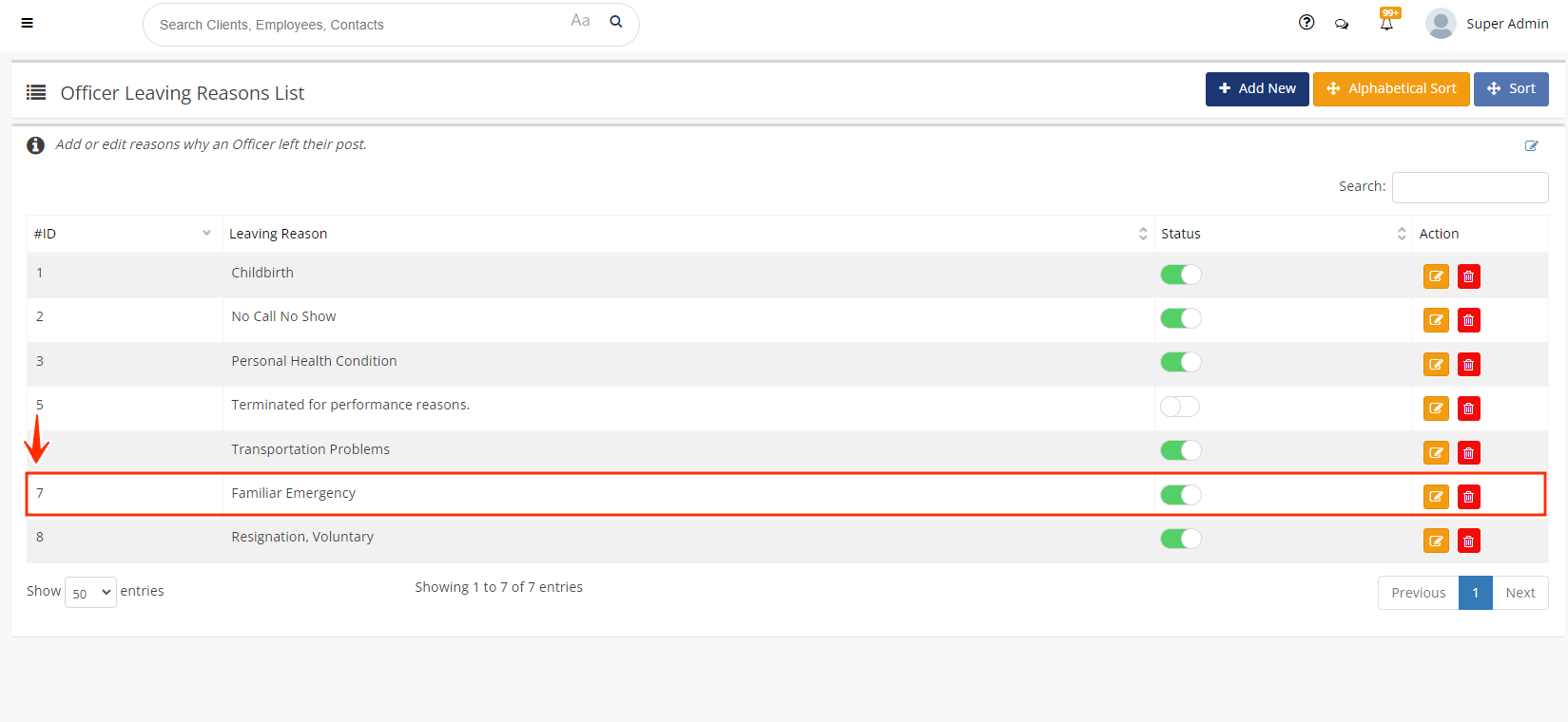 - You will see the reason added to the list. Here you can edit or delete it using the action buttons on the right-hand side of the screen.