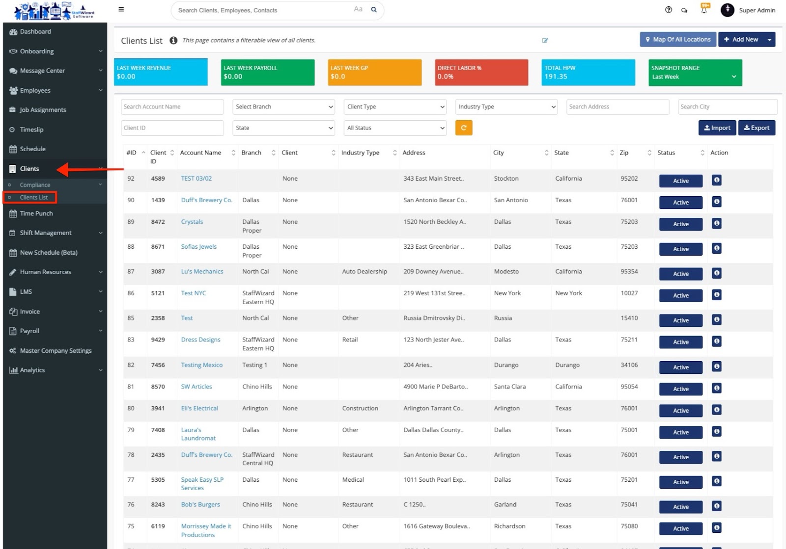 In the sidebar on the left, click on “Clients,” then select “Client List.” Choose the specific client you want to grant access to the Client Portal. Keep in mind that the Client Portal is client-specific, so you’ll only be able to view job orders/ post locations for one client at a time.