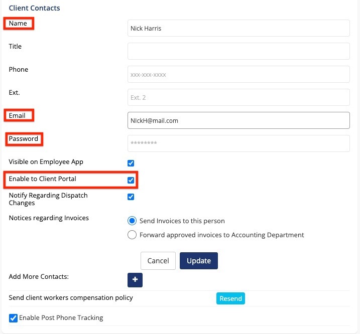 After selecting the client, navigate to the Client Contact window. In this section, you can enter the contact's name, job title, phone number, and most importantly, their email address and password. This email will be used to send the client their login credentials and the link to access the Client Portal.