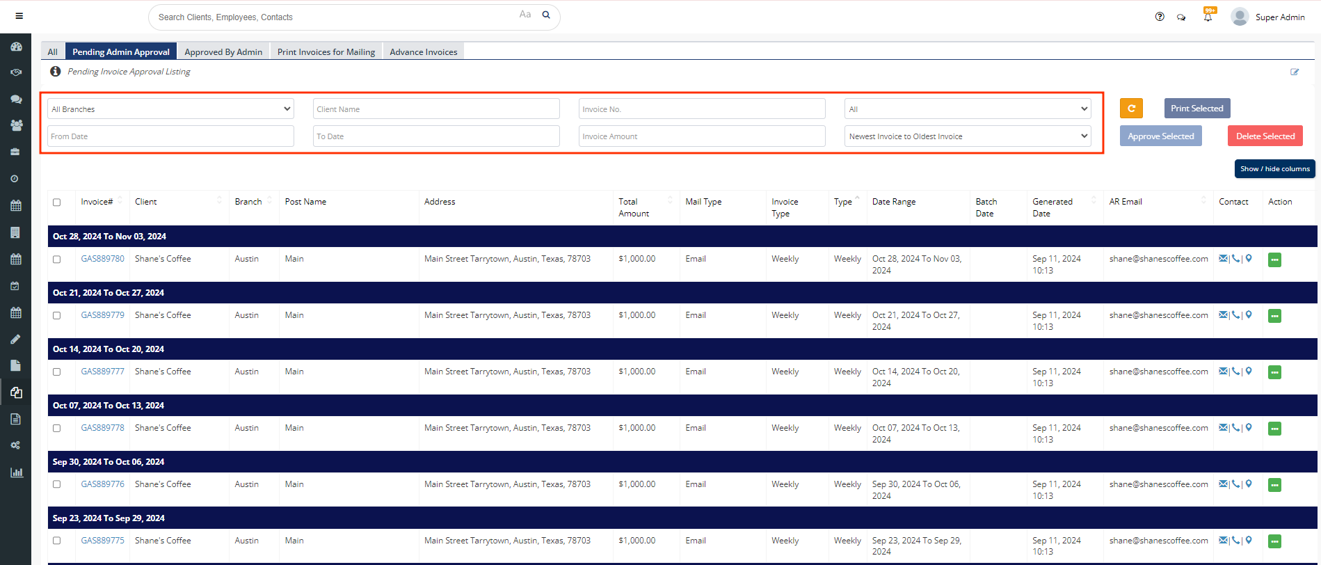 - You can use the filters to look by invoice number, client name, branches, etc.