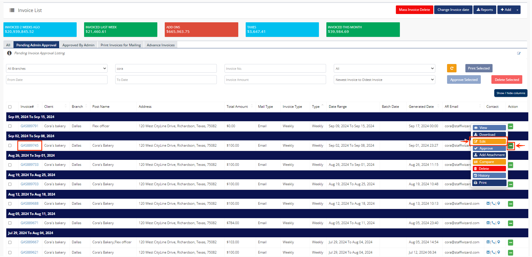 - Once you find the invoice, locate the green action button, on the right-hand of the screen and click the option "Edit".