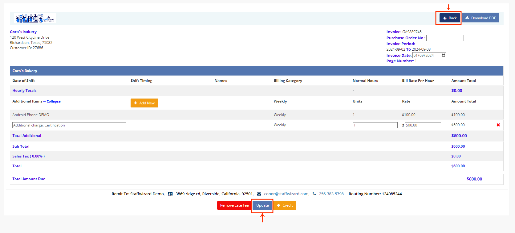 - Once all is set, click the button "Update" and after the invoice is successfully updated, click the button "Back".