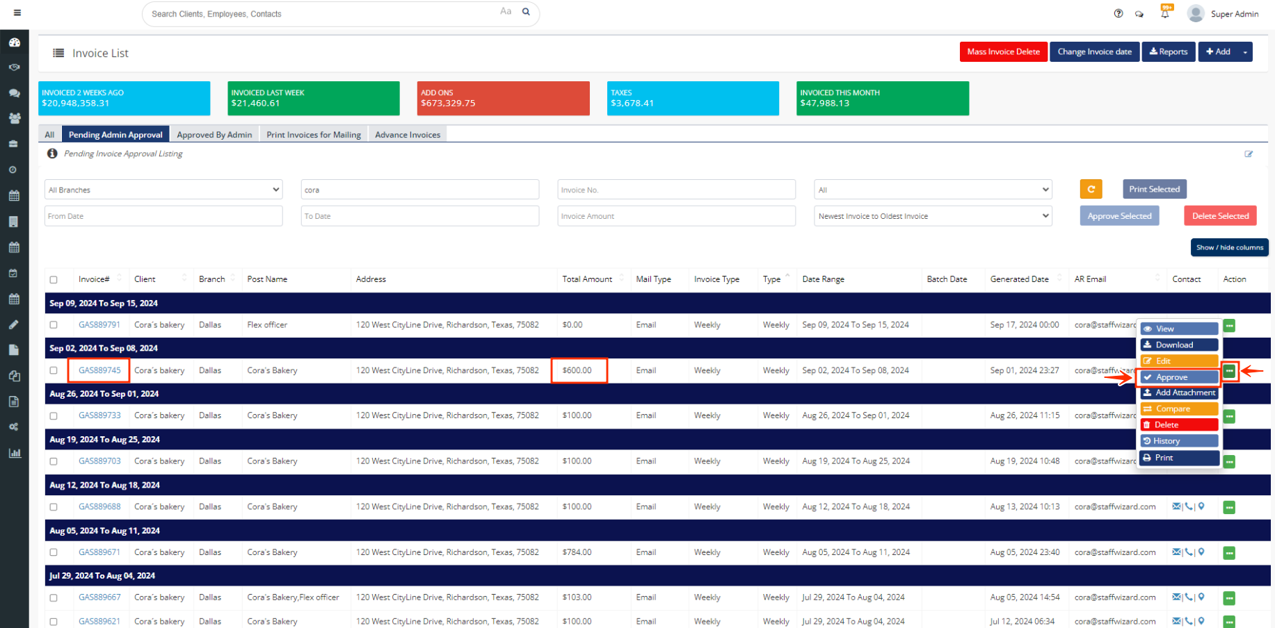 - Locate the invoice you edited and verify the quantity was updated, after that, you can approve it with the same green button used in previous steps, by clicking "Approve".