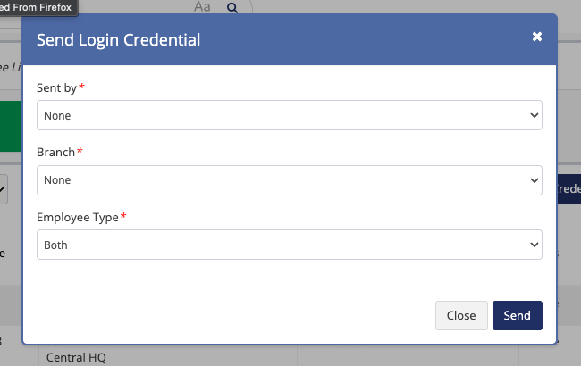 Clicking this button will give you an option to choice: who is sending it, Which Branch to send to and which employee type to send to (Admin or Employee).