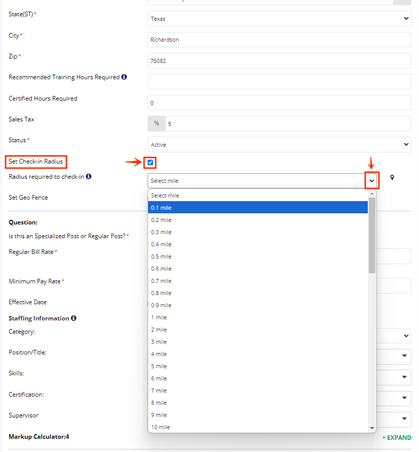 - Locate the "Set Check-in Radius" and click the check box to enable it. This will add a section for you to select the miles and indicate the miles you desire.