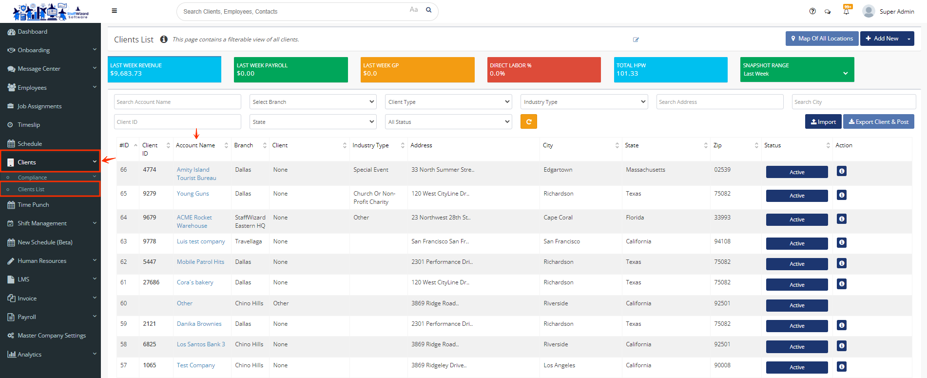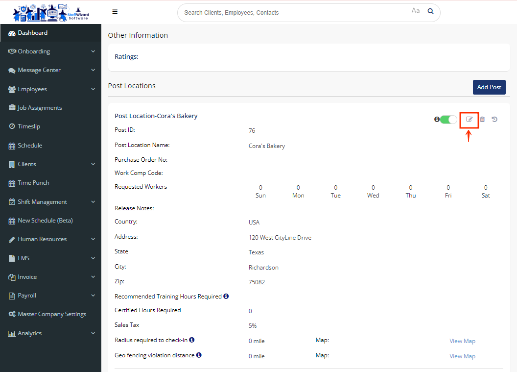 - Once you are on the client´s profile, under the "General" tab, scroll down until you see the section "Post Location" and click the button to edit the information of the section.