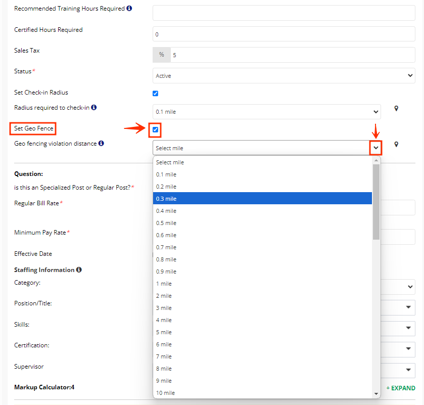 - In the same section of the Check-in Radius, you will see the option "Set Geo-Fence", enable it, and set the miles, which need to be wider than the miles for the Check-in Radius.