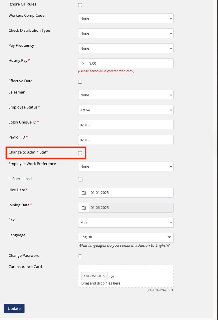 If the employee isn’t currently an admin, you’ll see a field labeled “Change to Admin Staff.” If the employee is already an admin and needs to be switched back to a standard role, the field will be labeled “Change to Employee.” Checking this box will update their role accordingly—either promoting them to admin or reverting them to a standard employee.